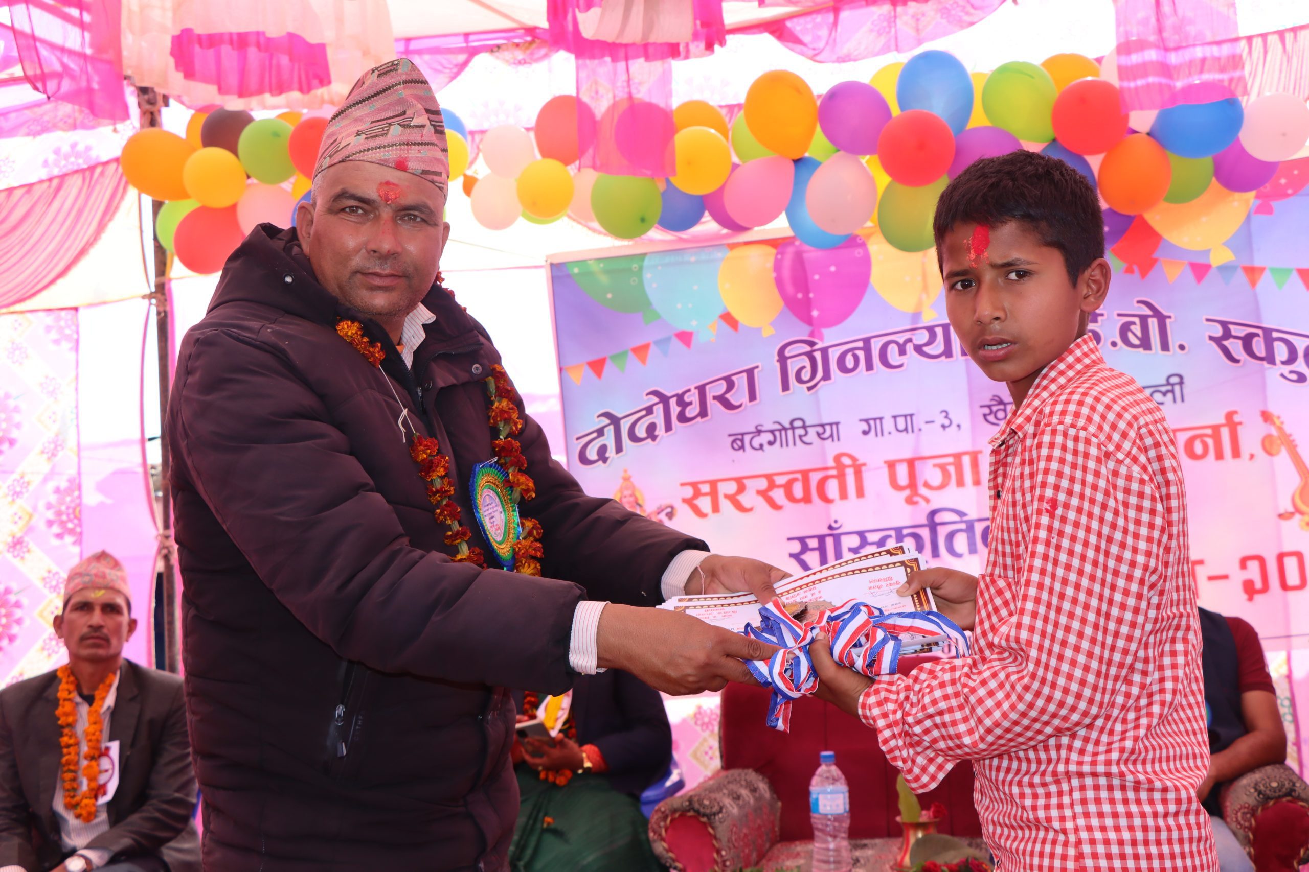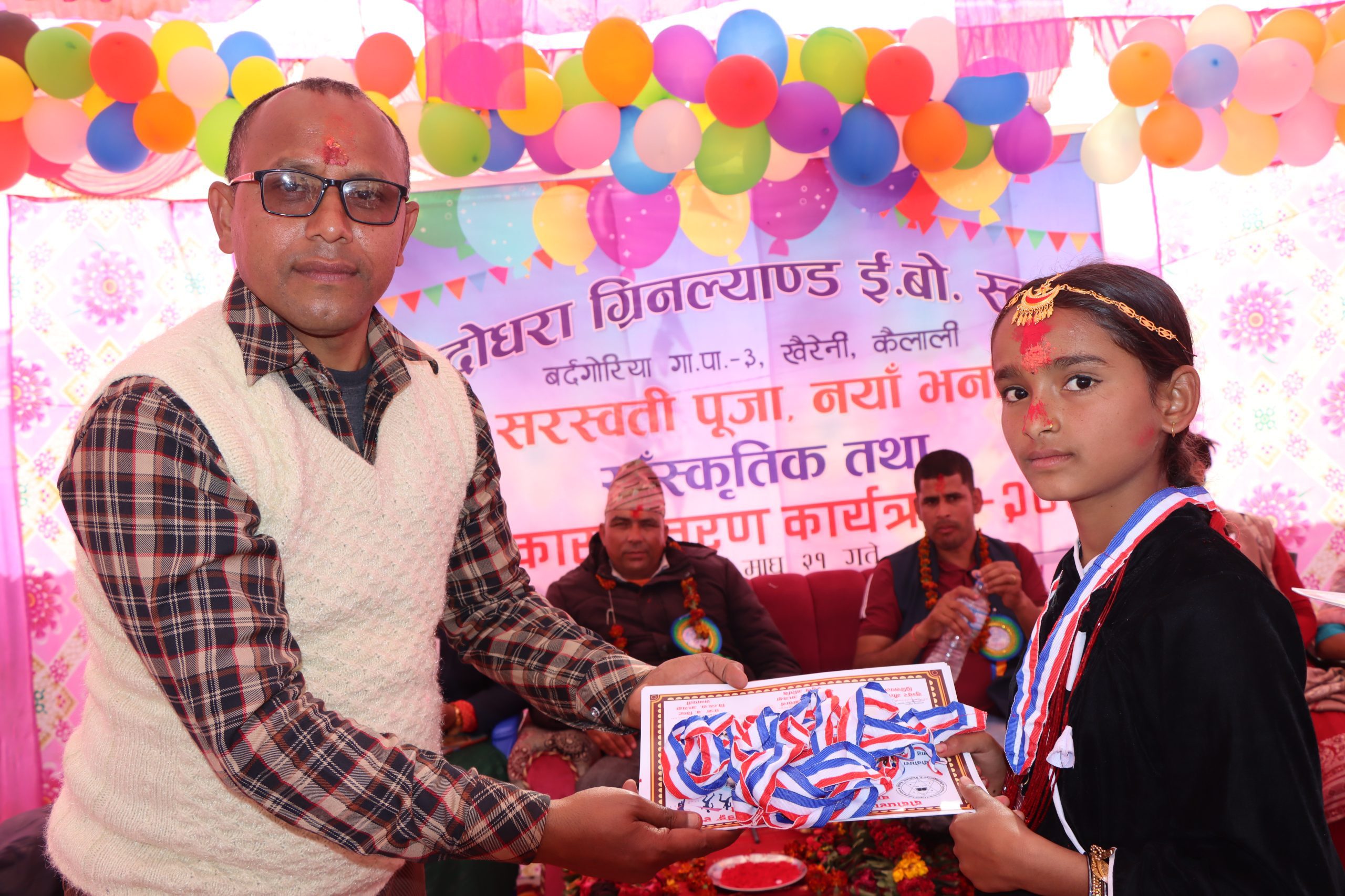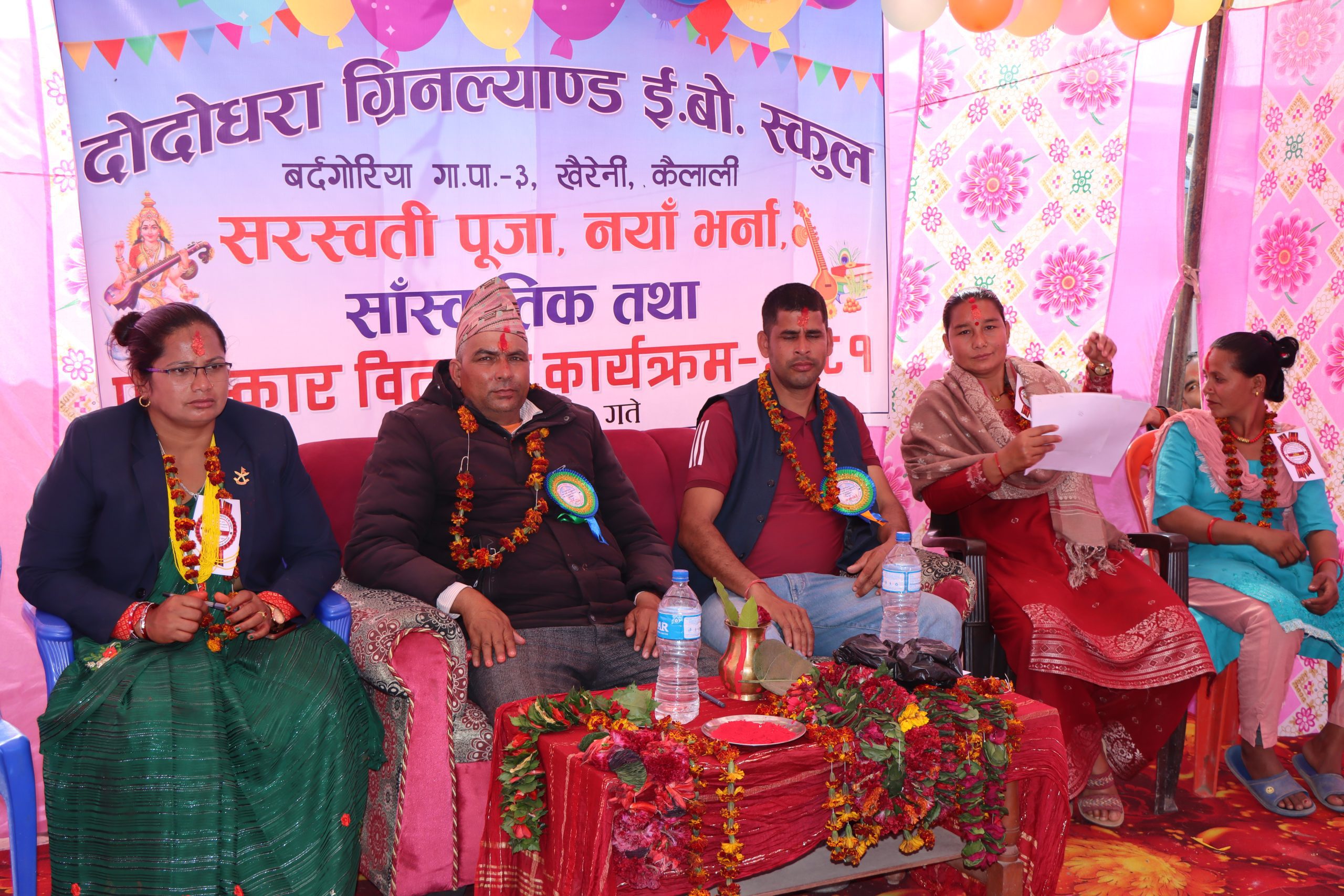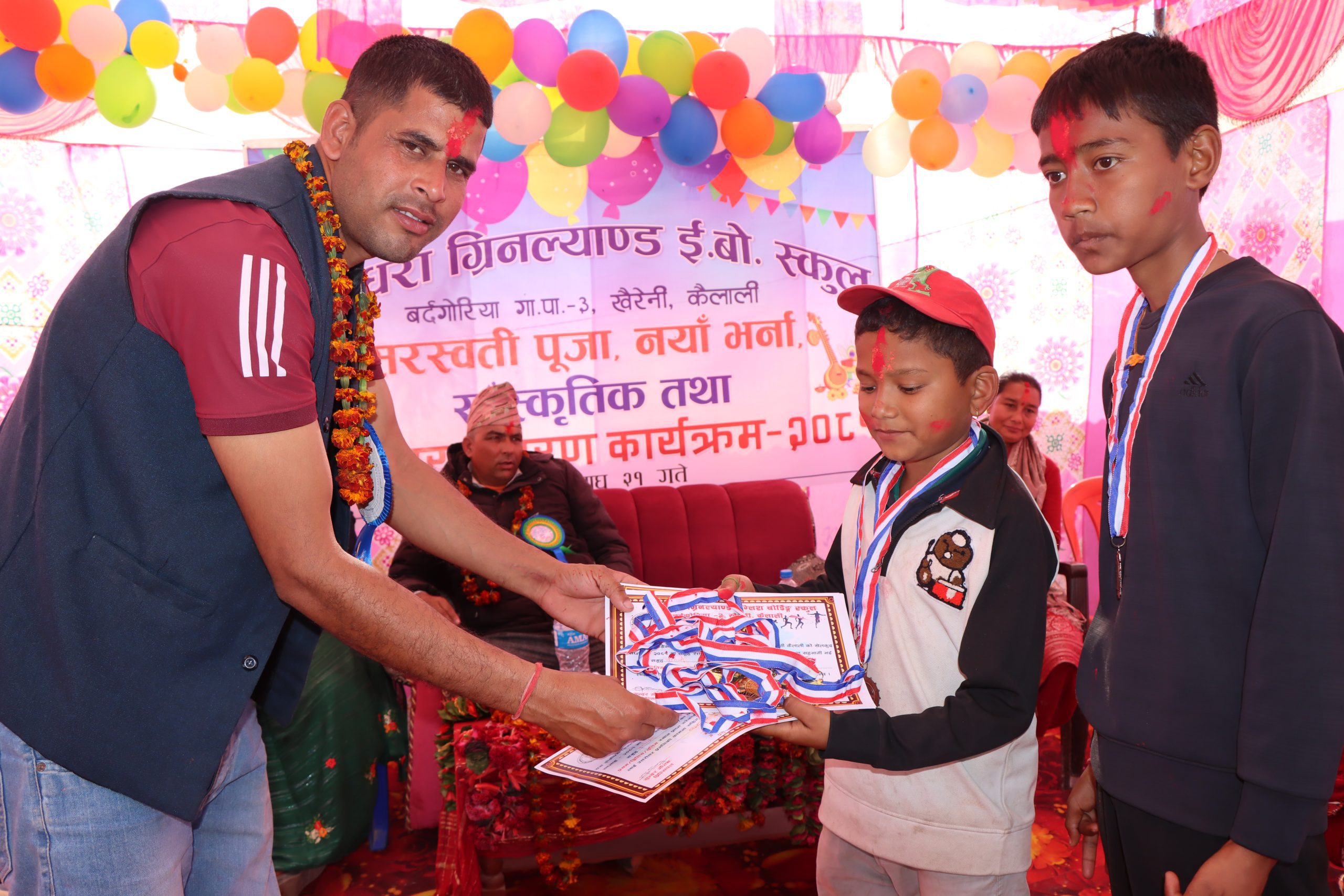 कैलाली । कैलालीको बर्दगोरिया गाउँपालिका वडा नं ३ खैरेनी स्थित दोदोधरा ग्रिनल्याण्ड इंग्लिश बोर्डिङ्ग स्कूलमा सोमबार सरस्वती पूजा , नयाँ भर्ना सांस्कृतिक कार्यक्रम सहित पुरस्कार वितरण समारोह सम्पन्न भएको छ ।