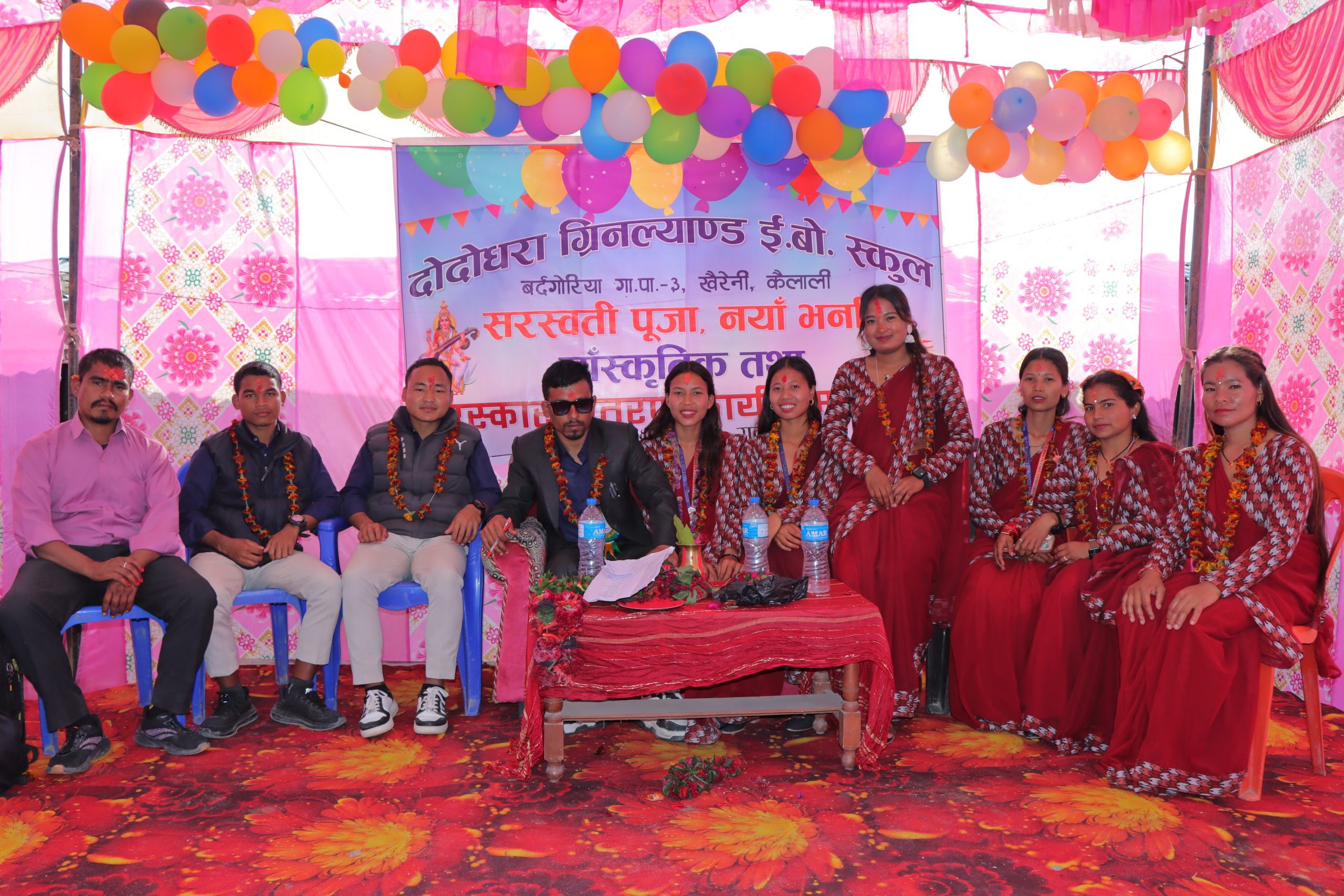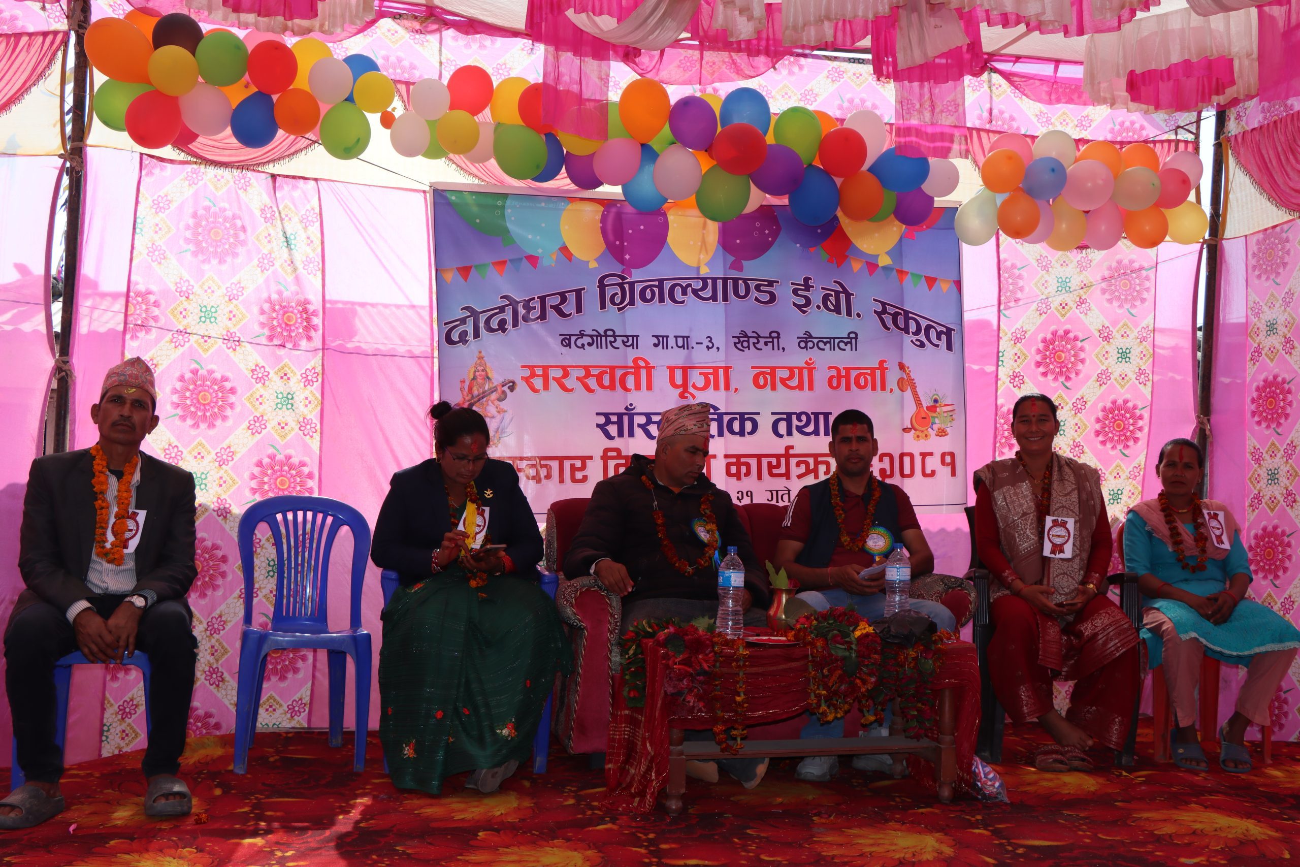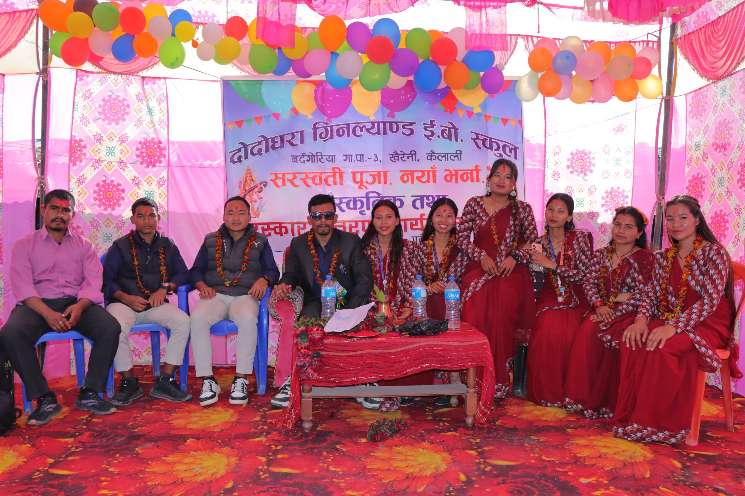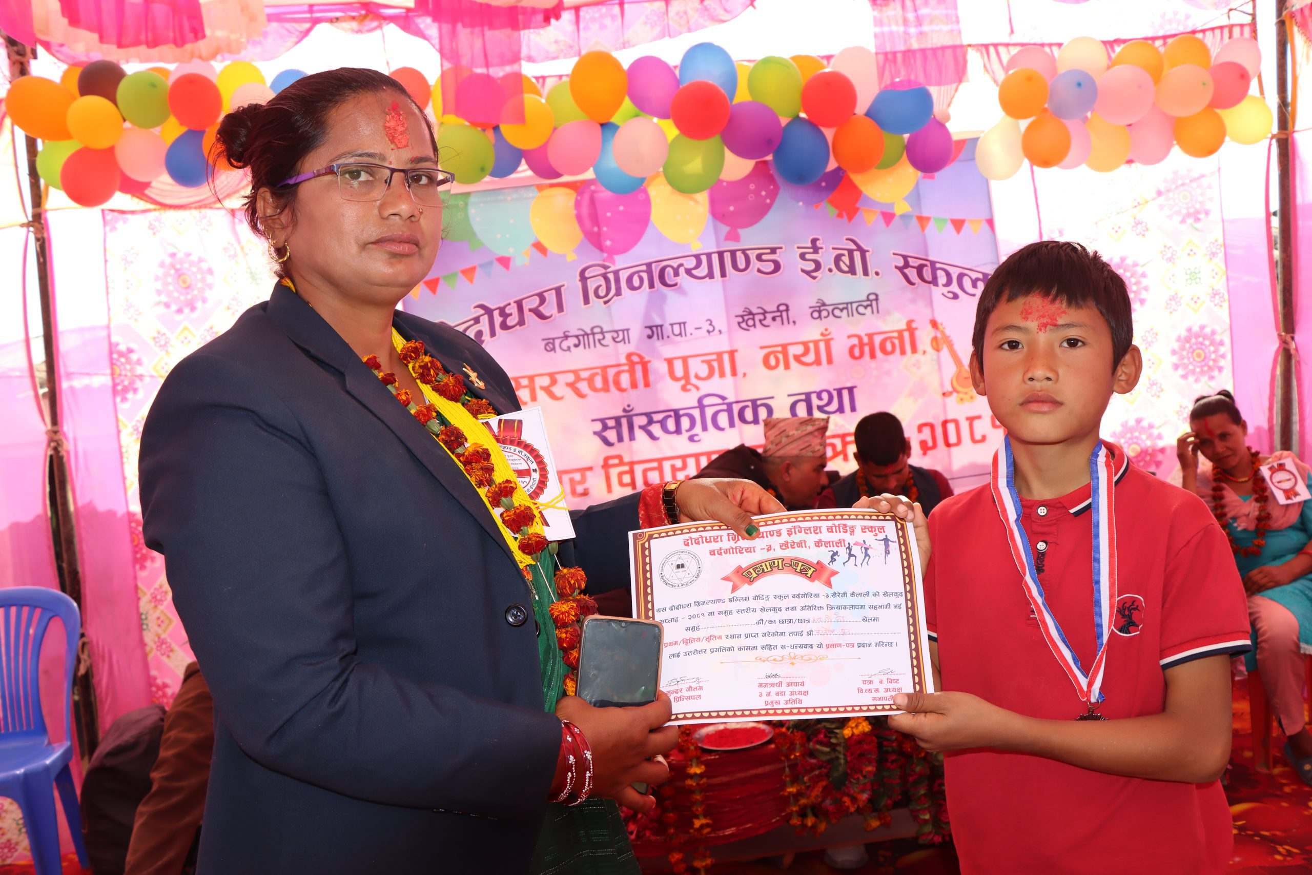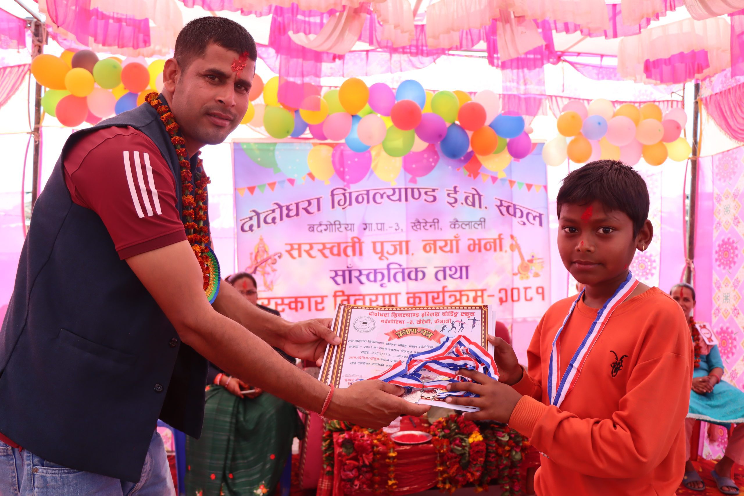 कैलाली । कैलालीको बर्दगोरिया गाउँपालिका वडा नं ३ खैरेनी स्थित दोदोधरा ग्रिनल्याण्ड इंग्लिश बोर्डिङ्ग स्कूलमा सोमबार सरस्वती पूजा , नयाँ भर्ना सांस्कृतिक कार्यक्रम सहित पुरस्कार वितरण समारोह सम्पन्न भएको छ ।