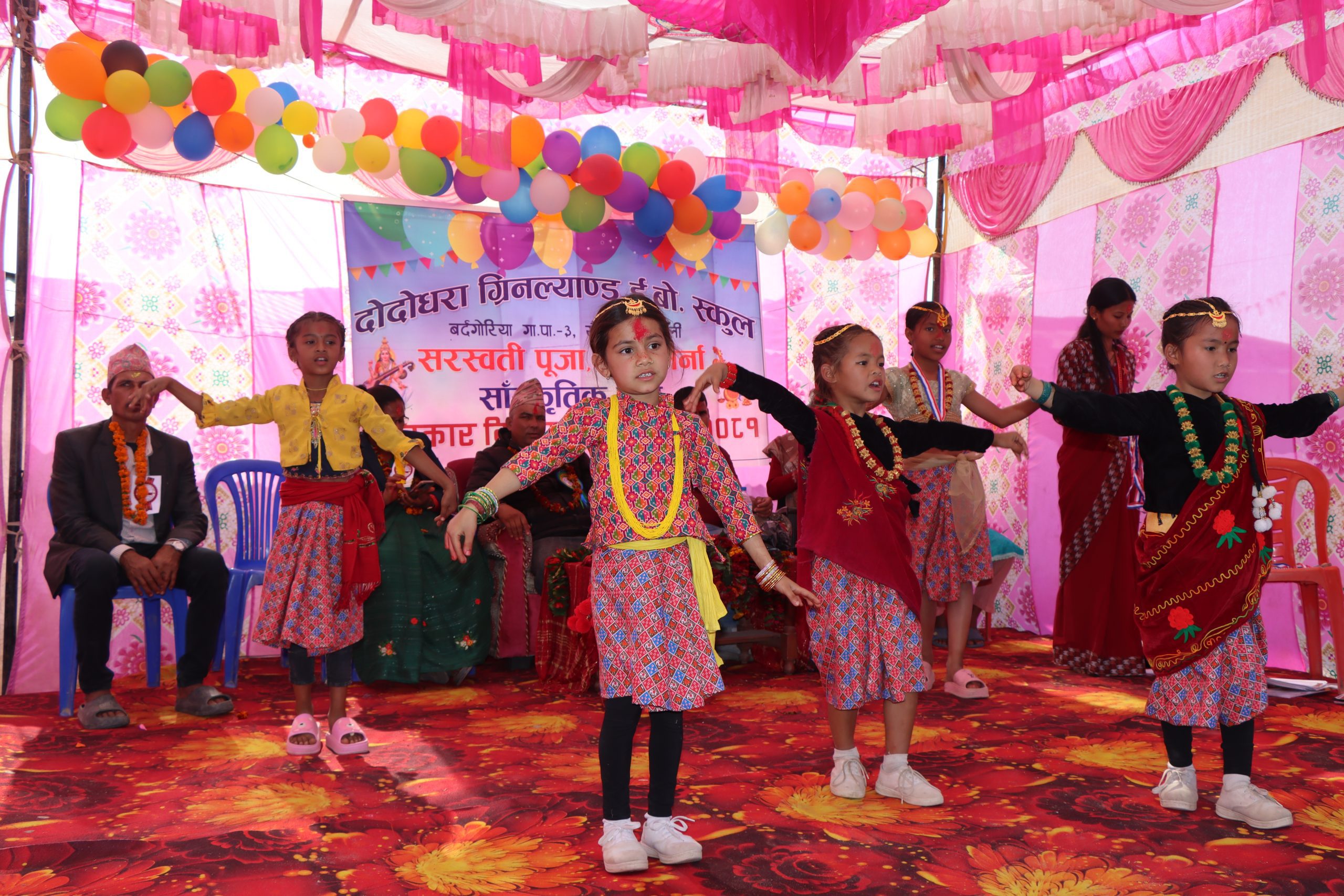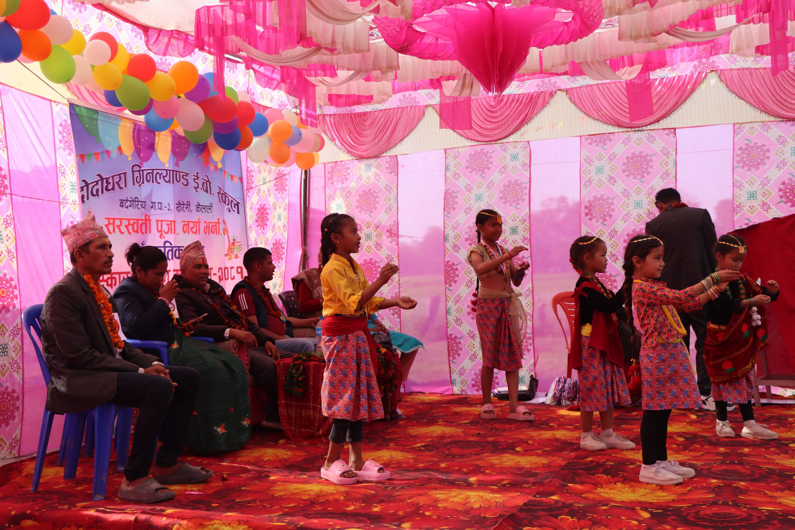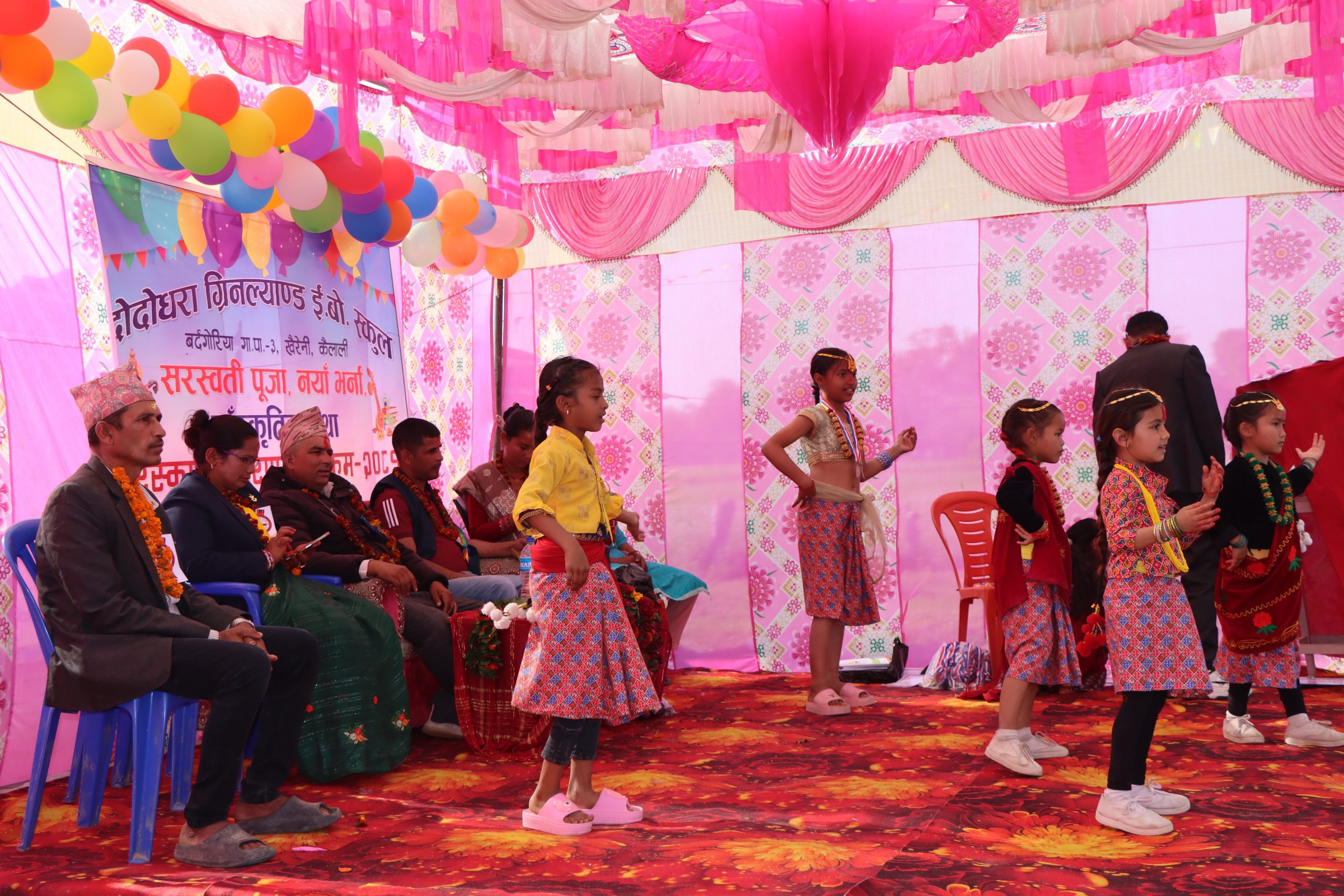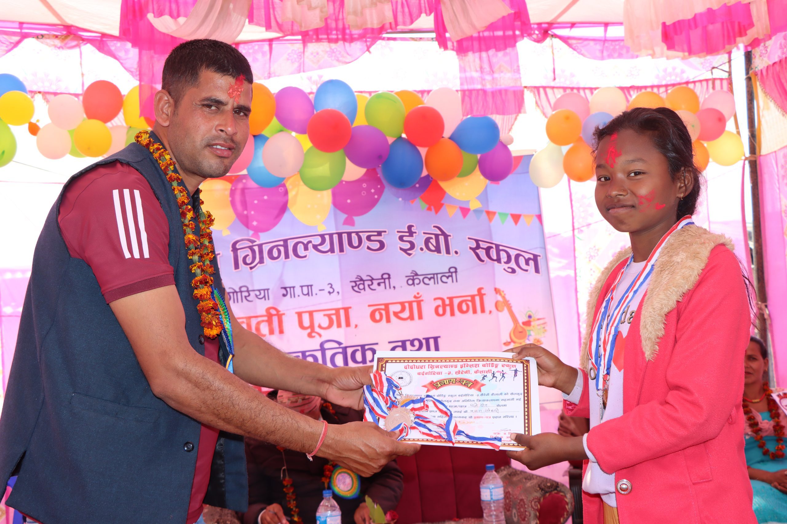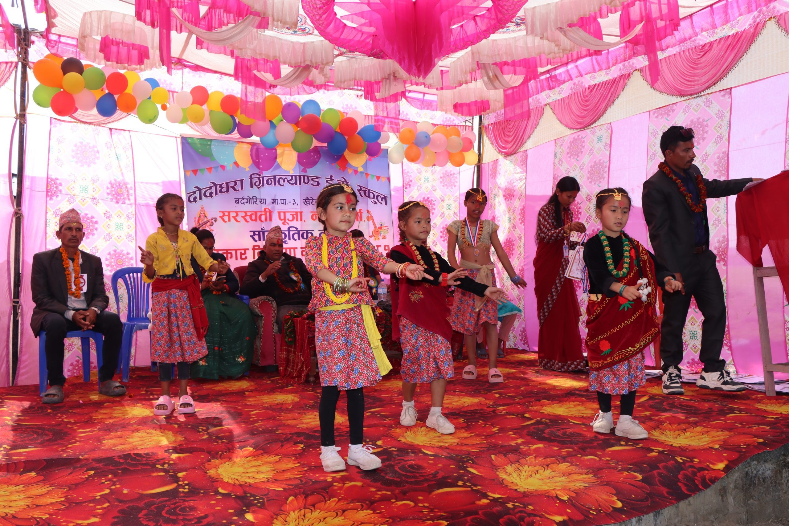 कैलाली । कैलालीको बर्दगोरिया गाउँपालिका वडा नं ३ खैरेनी स्थित दोदोधरा ग्रिनल्याण्ड इंग्लिश बोर्डिङ्ग स्कूलमा सोमबार सरस्वती पूजा , नयाँ भर्ना सांस्कृतिक कार्यक्रम सहित पुरस्कार वितरण समारोह सम्पन्न भएको छ ।