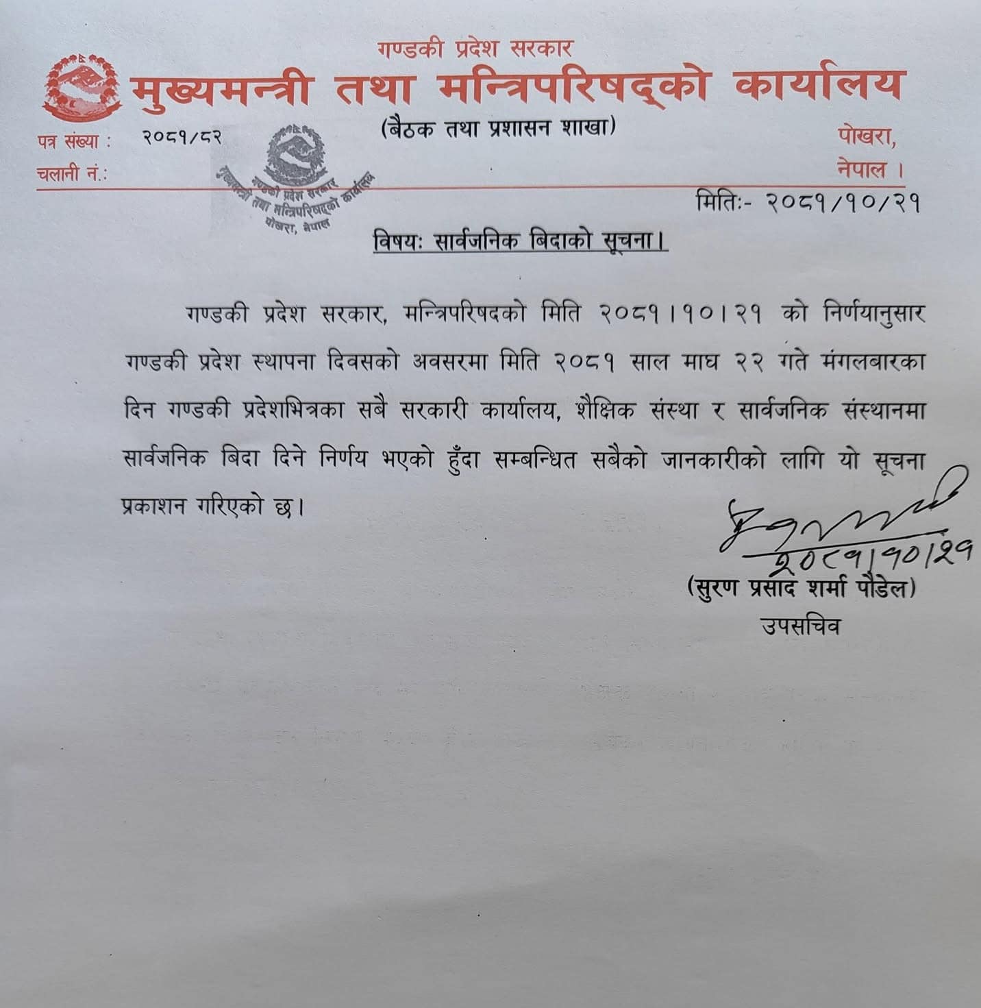पोखरा। गण्डकी प्रदेशले आज सार्वजनिक बिदा दिएको छ। मन्त्रिपरिषदको सोमबारको निर्णयअनुसार माघ २२ गते मंगलबार सार्वजनिक बिदा दिने निर्णय भएको मुख्यमन्त्री तथा मन्त्रिपरिषद कार्यालयका उपसचिव सुरणप्रसाद शर्मा पौडेलले जानकारी दिए। गण्डकी प्रदेश स्थापनाको अवसरमा सरकारले प्रदेशभर सार्बजनिक बिदा दिने निर्णय गरेको हो।