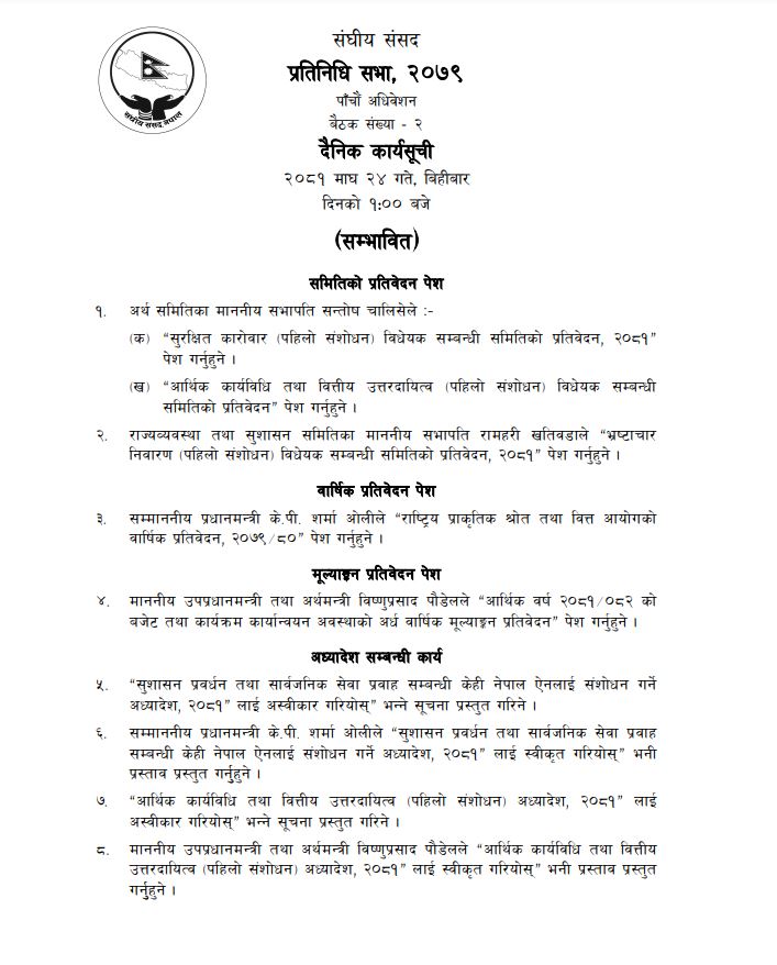 साथै, राज्य ब्यवस्था तथा सुशाषन समितिकाका सभापति रामहरी खतिवडाले ‘भ्रष्टचार निवारण (पहिलो संसोधन) बिधेयक सबन्धी समितिको प्रतिबेदन, २०८१ पेश गर्नेछन् । संसद सचिवालयका अनुसार प्रधानमन्त्री केपी शर्मा ओलीले ‘राष्ट्रिय प्राकृतिक श्रोत तथा बित्त आयोगको बार्षिक प्रतिवेदन, २०७९÷८० पेश गर्ने’ कार्यसुचीमा उल्लेख गरिएको छ ।