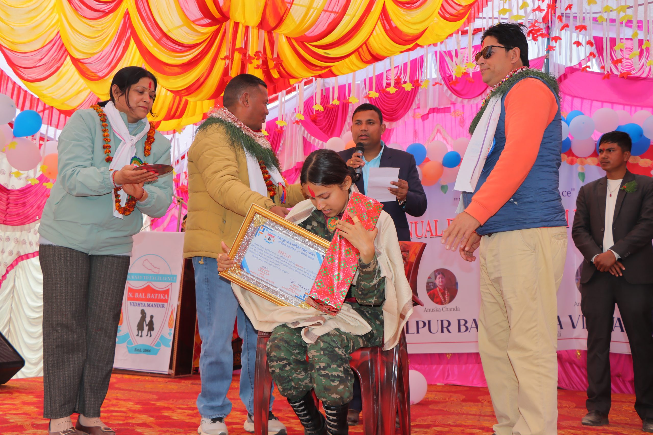 यसै गरि बिधालयले सरिता कठरियालाई उत्कृष्ट शिक्षिकाको अवार्ड सहित नगद १० हजारले सम्मान गरेको छ । बर्ष भरिकै उत्कृष्ट विद्यार्थी बिष्णा जोशीले हात पार्दा अनुशासन तर्फ छत्र बम र समु रोकाया उत्कृष्ट बन्न सफल भए । बिधालयले सरसफाइ तर्फ शिखा शाही र किरण माझिलाई उत्कृष्ट भन्दै पुरस्कृत गरेको छ । शिर्जनशिलको पुरस्कार बिधालयले निराजन राना मगरलाई प्रदान गरेको छ । यसै गरि असल अभिभावकको पुरस्कार जमुना देवि शाहलाई हस्तान्तरण गरेको छ । बिधालयले प्रत्येक बर्ष खेल संगै उपहार दिने गरेको लोकल भालेको तौल पत्ता लगाउन रामपुर निवासी दिपक शाह सफल भएका छन उनले २ किलो ३ सय २० ग्रामको लोकल कुखुरा हात पारे ।