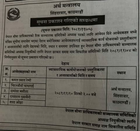 प्राधिकरणको अध्यक्ष पदका लागि १२ जनाको आवेदन परेको थियो । ‘सर्टलिस्ट’ मा परेका ५ जनालाई फागुन ११ गते व्यवसायिक कार्ययोजनाको प्रस्तुतिकरण र अन्तरवार्ताको लागि बोलाएको अर्थमन्त्रालयले जनाएको छ । बिमा प्राधिकरणका अध्यक्ष सूर्य सिलवाल माथि भ्रष्टाचार मुद्दा लागेपछि सो पद अहिले खाली छ ।