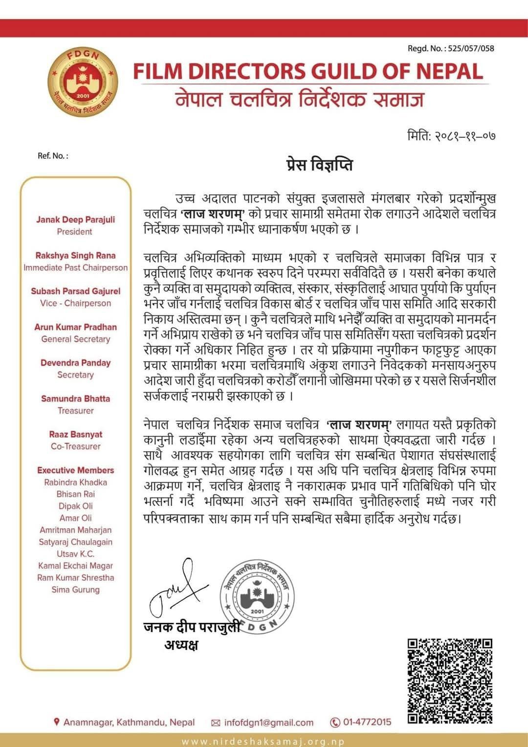 उच्च अदालत पाटनले प्रदर्शनको तयारीमा रहेको ‘लाज शरणम्’को प्रचारमा लगाएको रोक प्रति चलचित्र निर्देशक समाजले आफ्नो गम्भीर ध्यानाकर्षण भएको जनाएको छ । समाजले बुधबार विज्ञप्ति जारी गर्दै चलचित्र ‘लाज शरणम्’को नाममा अदालतबाट जारी भएको बन्देजले चलचित्रको करोडौँको लगानी जोखिम र सृजनशील सर्जकलाई राम्ररी झस्काएको समेत जनाएको छ ।