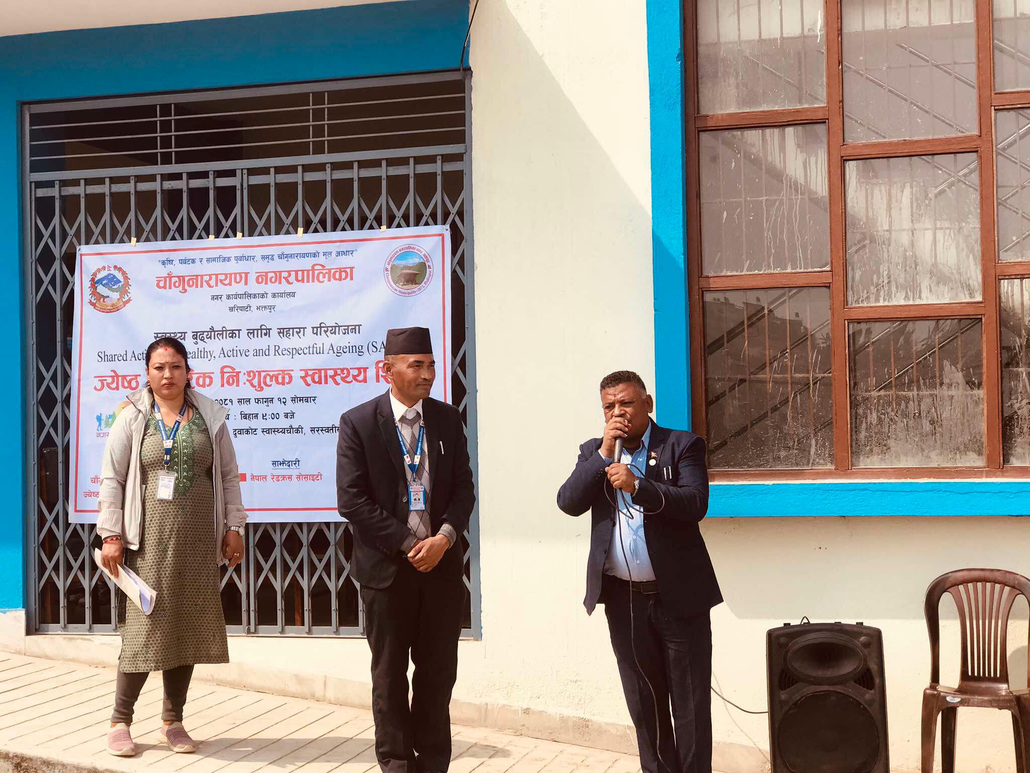 भक्तपुर । भक्तपुरको चाँंगुनारायण नगरपालिका वडा नं १ दुवाकोटका तीन सय ६ जना जेष्ठ नागरिकहरुले आफनै घरआँंगनमा सोमबार निःशुल्क सेवा पाएका छन् ।चाँगुनारायण नगरपालिका भक्तपुर र सहारा परियोजनाको आयोजनामा दुवाकोट स्वास्थ्य चौकीमा एकदिने जेष्ठ नागरिक निःशुल्क स्वास्थ्य शिविर भएको थियो । शिविरका लागि चाँंगुनारायण नगरपालिका वडा नं १ र जेष्ठ नागरिक मिलन चौतारी वडा नं १ चाँंगुनारायणले समन्वय गरिदिएको थियो । साथै कार्यक्रम नेपाल रेडक्रस सोसाइटी भक्तपुरको साझेदारीमा भएको थियो । शिविरमा साधारण चेकजाँंचदेखि नाक, कान, घाँटीको परीक्षण गरिएको थियो । साथै हाड जोर्नी, आँंखा, स्त्री रोग परीक्षण पनि गरिएको थियो । साथै सुगर, प्रेसरको पनि निःशुल्क परीक्षण गरिएको थियो । शिविरमा निःशुल्क औषधि पनि वितरण गरिएको थियो । शिविरको चाँंगुनारायण नगरपालिकाका प्रमुख जीवन खत्रीले विहान एक समारोहवीच उदघाटन गरेका थिए । त्यस अवसरमा उनले नगरबासीको स्वास्थ्यका लागि नगरपालिकाले विशेष ध्यान दिइरहेको बताए । उदघाटन कार्यक्रममा चाँंगुनारायण नगरपालिका वडा नं १ का वडा अध्यक्ष सिजन कार्की, नेपाल रेडक्रस सोसाइटी भक्तपुरका सभापति परशु पाण्डेलगायतले आआफनो धारणा राखेका थिए । चाँंगुनारायण नगरपालिका स्वास्थ्य शाखाका प्रमुख दिलकुमार दुवालका अनुसार परियोजना अन्तर्गत नगरपालिकाभरि शिविर हुँदैछ । उनका अनुसार परियोजना अन्तर्गत पहिलो पटक वडा नं ५ मा शिविर भएको थियो । त्यसपछि वडा नं ७, वडा नं ६ मा पनि शिविर भइसकेको छ । सोमबार भने वडा नं १ मा शिविर गरिएको हो । बाँंकी वडाहरुमा पनि क्रमशः शिविर गर्दै जाने तालिका रहेको उनले सुनाए । नेपाल रेडक्रस सोसाइटी भक्तपुरका कार्यालय प्रमुख एवं सहारा परियोजना प्रमुख उमा थापाले शिविरबाट धेरै जेष्ठ नागरिकहरु लाभान्वित भएको जनाइन । घरआँंगनमै सेवा पाउँंदा जेष्ठ नागरिकहरु खुशी भएको उनले सुनाइन् ।टोलीमा चार जना शिषेशज्ञसहित पाँंचजना डाक्टर, तीन जना नर्सले सेवा दिएका थिए । साथै स्वास्थ्य चौकी, नगरपालिकाको स्वास्थ्य शाखा, रेडक्रस भक्तपुर, जनप्रतिनिधिहरुको टोली पनि सेवामा सहभागी थिए ।