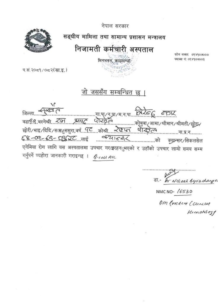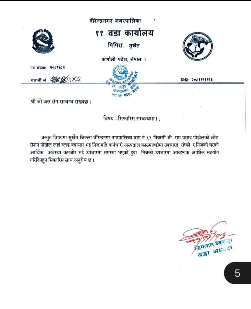 सुर्खेत । सुर्खेत वीरेन्द्रनगर नगरपालिका–११ निवासी १८ वर्षीय रोशन पोख्रेललाई रक्त क्यान्सर  पुष्टि भएको छ । उनी हाल कक्षा १२ मा अध्ययनरत छन् ।रोशनकाे बानेश्वरस्थित सिभिल अस्पतालको बेड नम्बर २३१ मा करिब १५ दिनदेखि उपचार भइरहेको छ । गम्भीर राेग लागेकाे पुष्टि भएपछि उनकाे परिवार चिन्तामा परेकाे छ । आर्थिक अभावका कारण उनकाे उपचारमा सहयाेग गर्न परिवारले अपिल गरेकाे छ ।उनको परिवार, जो कृषि पेशामा आबद्ध रहेका छन्, आर्थिक अवस्थाको कमजोरीका कारण महँगो उपचार खर्च वहन गर्न संघर्षरत छन् । डाक्टरका अनुसार, उपचारका लागि अस्पतालमै रहनुपर्ने भएकोले यो परिवारका लागि अत्यन्त चुनौतीपूर्ण स्थिति उत्पन्न भएको छ ।यस कठिन परिस्थितिमा बिरामीको जीवन बचाउनका लागि आर्थिक सहयोगको अपिल गरिएको छ । तपाईंको सानो सहयोगले रोशनलाई नयाँ जीवनको आशा दिन सक्छ ।