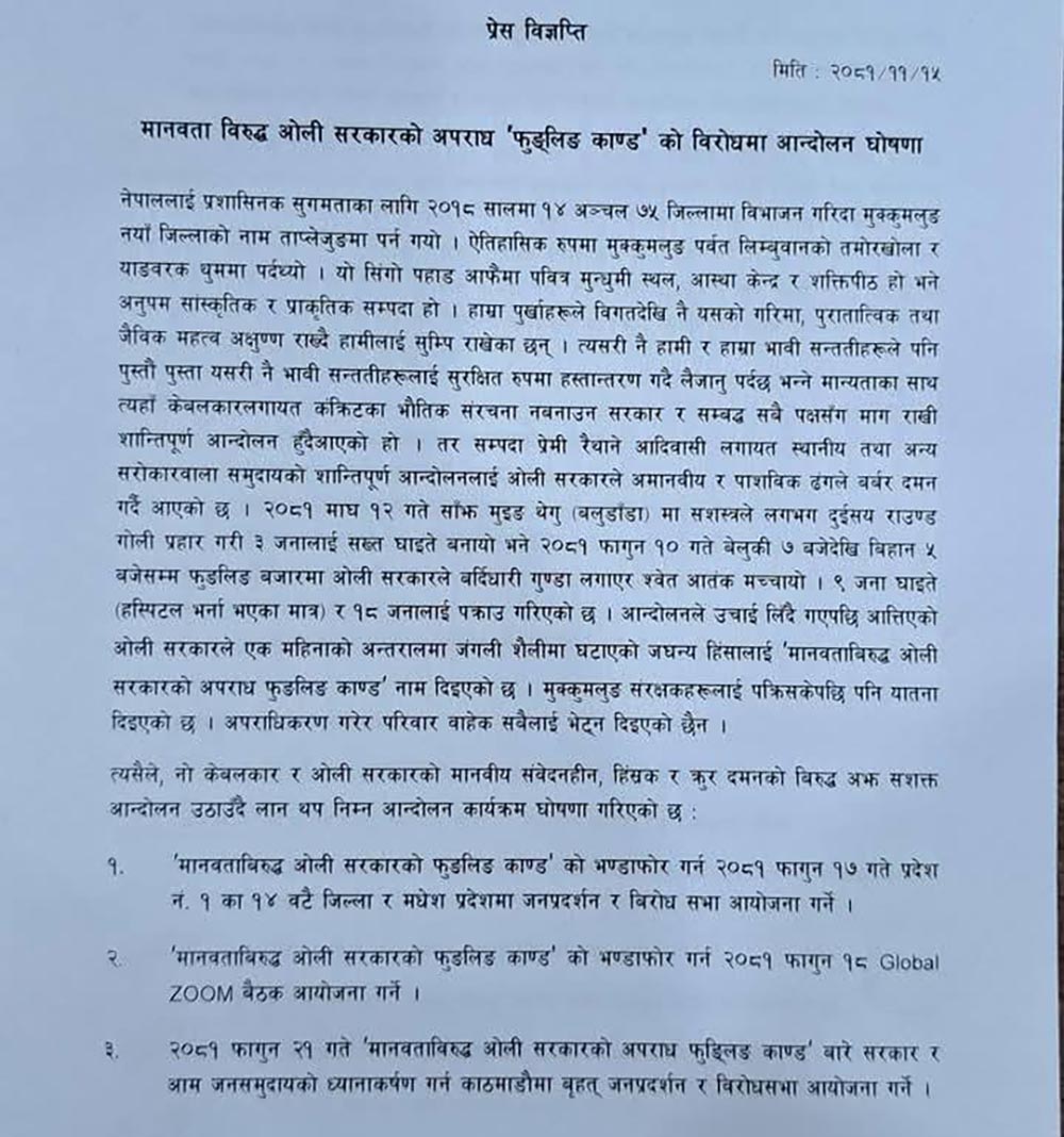 फागुन १८ गते ग्लोबल जुम बैठक गर्ने र त्यसको तीन दिनपछि काठमाडौंमा बृहत् जनप्रदर्शन र विरोधसभा गर्ने उल्लेख छ । साथै उनीहरुले ताप्लेजुङका प्रमुख जिल्ला अधिकारी नेत्रप्रसाद शर्मा र प्रहरी नायव उपरीक्षक रवि रावलका परिवारसहितको फोटो सार्वजनिक गर्ने र कारबाहीका लागि नेपाल सरकार र संयुक्त राष्ट्रसंघको सम्बन्धित निकायमा उजुरी दिने कार्यक्रम घोषणा गरेका छन् ।