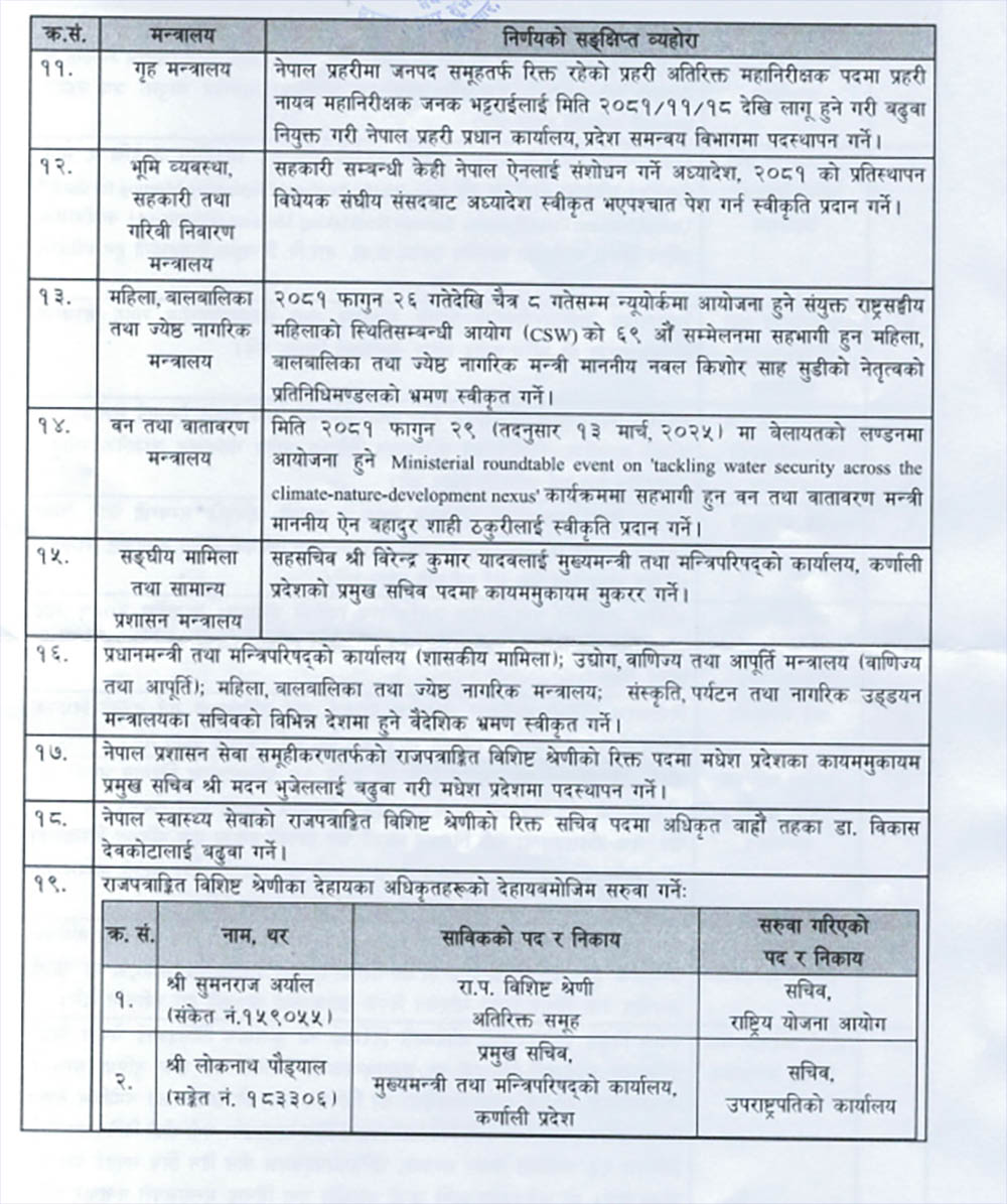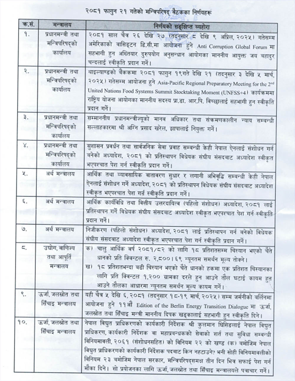 काठमाडौँ । सरकारका प्रवक्ता एवं सञ्चार तथा सूचना प्रविधिमन्त्री पृथ्वी सुब्बा गुरुङले मन्त्रिपरिषद्को बैठकका निर्णयहरु सार्बजनिक गरेका छन् ।शुक्रबार मन्त्री गुरुङले सञ्चार मन्त्रालयमा आयोजित कार्यक्रममा फागुन २१ गते बसेको मन्त्रिपरिषद्को बैठकका निर्णयहरु सार्बजनिक गरेका हुन् ।मन्त्रिपरिषद्को बैठकले गरेका विभिन्न १९ निर्णयहरु सार्बजनिक गरिएको छ ।