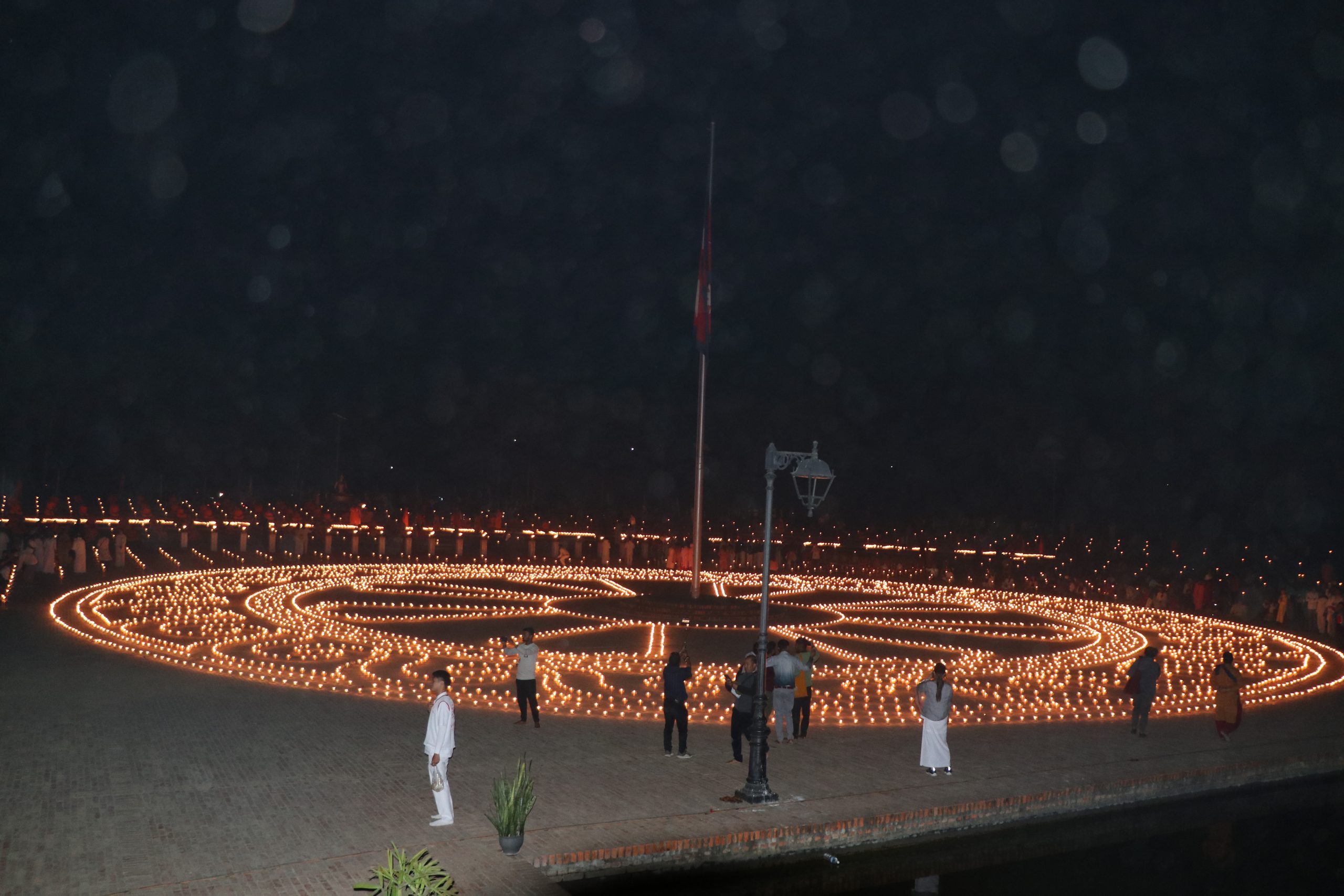 धम्मकाय फाउण्डेशनले भिक्षु भिक्षुणी, लामा गुरु, आनी, उपासक उपासिका र प्रवजित भएका ५ सय जना अल्पकालीन भिक्षुहरुको सहभागितामा शान्ति र साहर्दताका लागि दीप प्रज्वलन गरिएको हो । नेपालको झन्डा केन्द्रभाग मानी धम्मचक्रको आकार आउने गरी गरिएको दीप प्रज्वलनको अखिल नेपाल भिक्षु महासंघका अध्यक्ष धम्मशोभन महास्थविरले शुभारम्भ गरे ।