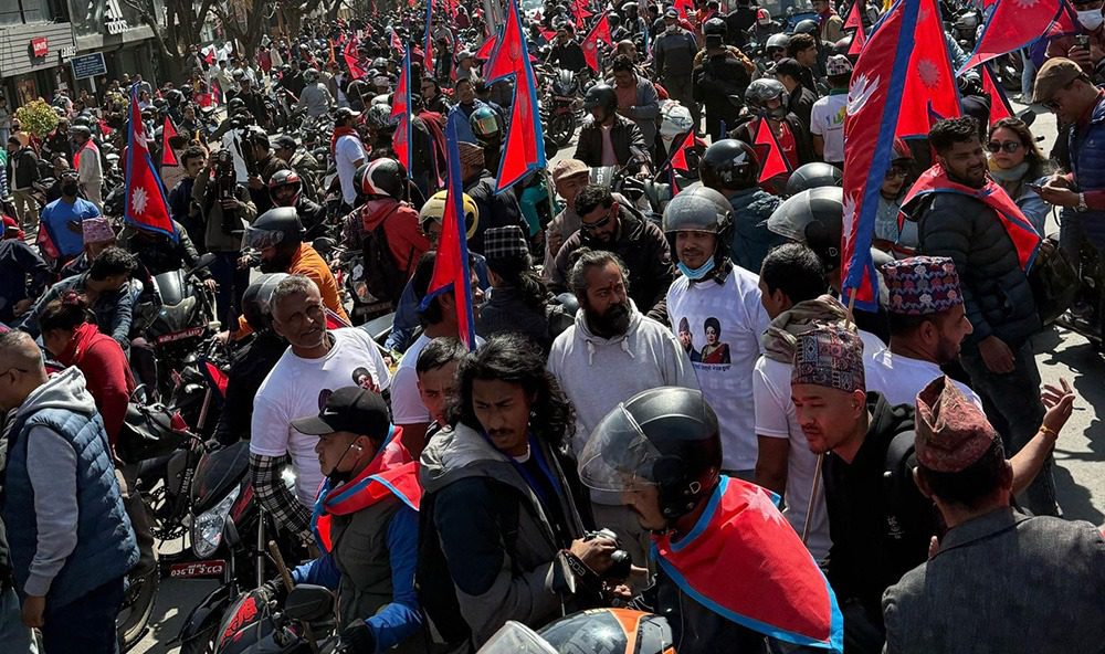 पूर्वराजा ज्ञानेन्द्रलाई काठमाडौँमा स्वागत गर्दै त्रिभुवन विमानस्थलबाट निर्मल निवाससम्म लैजाने कार्यक्रम अन्तर्गत राप्रपाका कार्यकर्ता र अन्य राजावादी अभियानमा जोडिएका राजवादीहरु विमानस्थल बाहिर भेला भएका हुन् ।