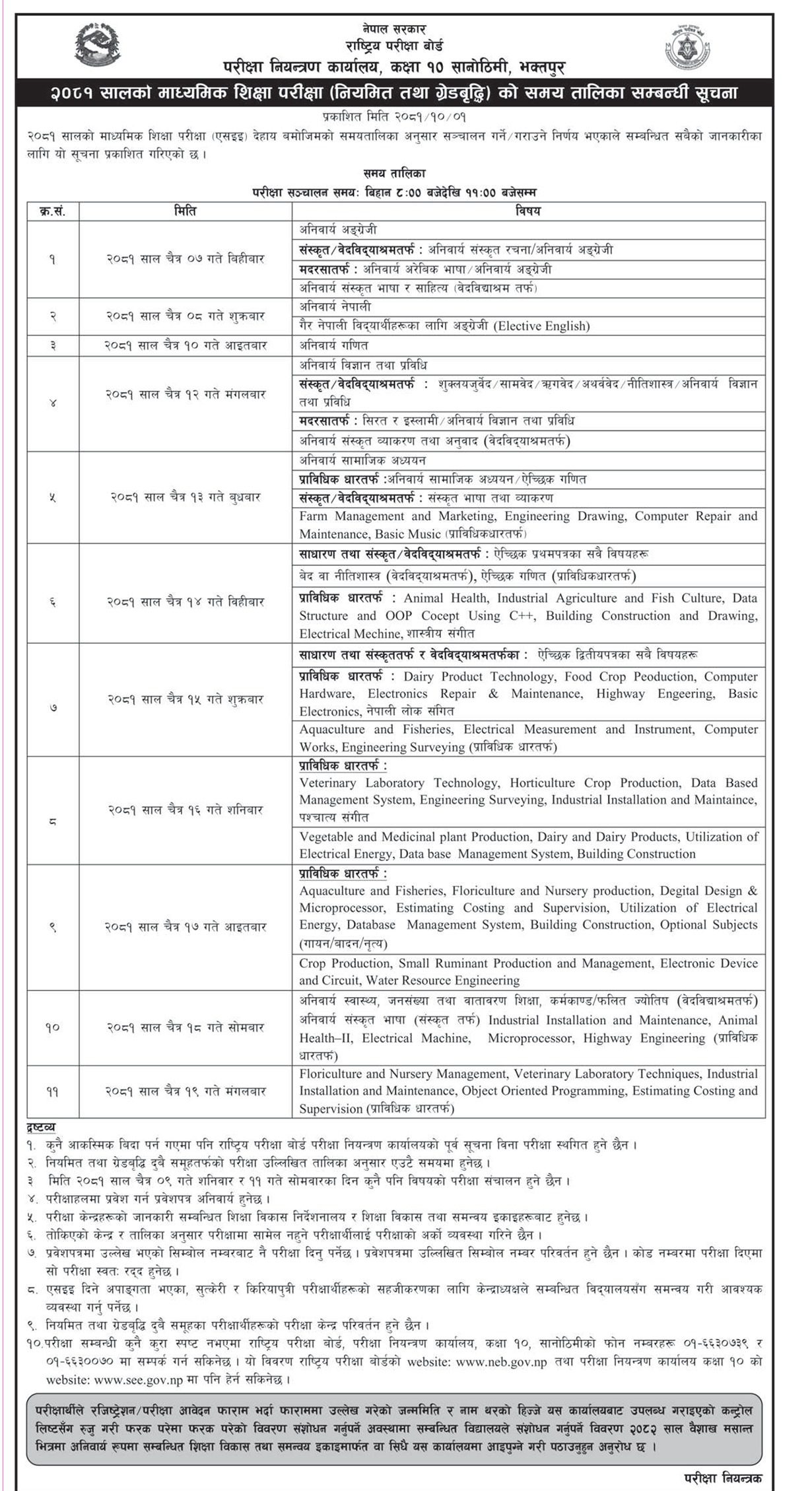 आज पहिलो दिन अनिवार्य अंग्रेजी विषयको परीक्षा हुने छ । यस दिन संस्कृत वेदविद्याश्रमतर्फ अनिवार्य संस्कृत र मदरासातर्फ अनिवार्य अरेविक भाषाको परीक्षा पनि हुदैँछ । दोस्रो दिन चैत ८ गते अनिवार्य नेपाली विषयको परीक्षा हुने छ भने सोही गैरनेपाली विद्यार्थीहरुका लागि अंग्रेजी (इलेक्टिभ इङ्गलिस) को परीक्षा हुने परिक्षा नियन्त्रण कार्यालयले जनाएको छ ।