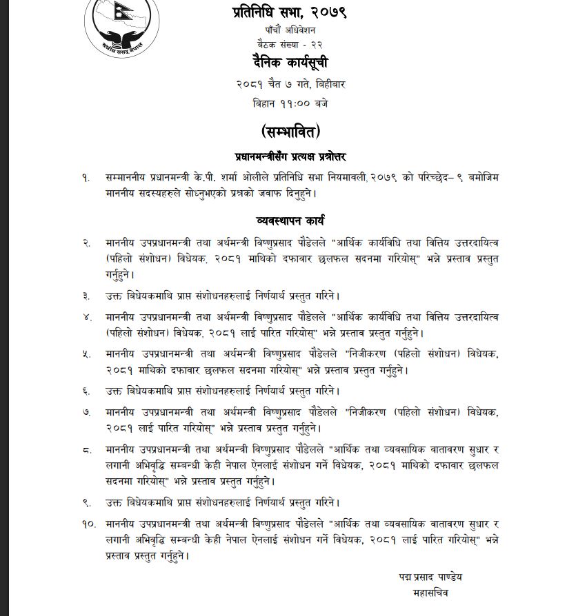 काठमाडौं । प्रतिनिधिसभाको बैठक बस्दैँछ । संघीय संसद भवन, नयाँ बानेश्वरमा उक्त बैठक बस्नेछ । बैठक बिहान ११ः०० बजे बोलाइएको छ । संसद सचिवालयका अनुसार आजको बैठकमा प्रधानमन्त्री केपी शर्मा ओलीसँग प्रश्नोत्तर कार्यक्रम हुनेछ भने उपप्रधान तथा अर्थमन्त्री बिष्णु पौडेलले तीनवटा बिधेयक प्रस्तुत गर्नेछन् ।