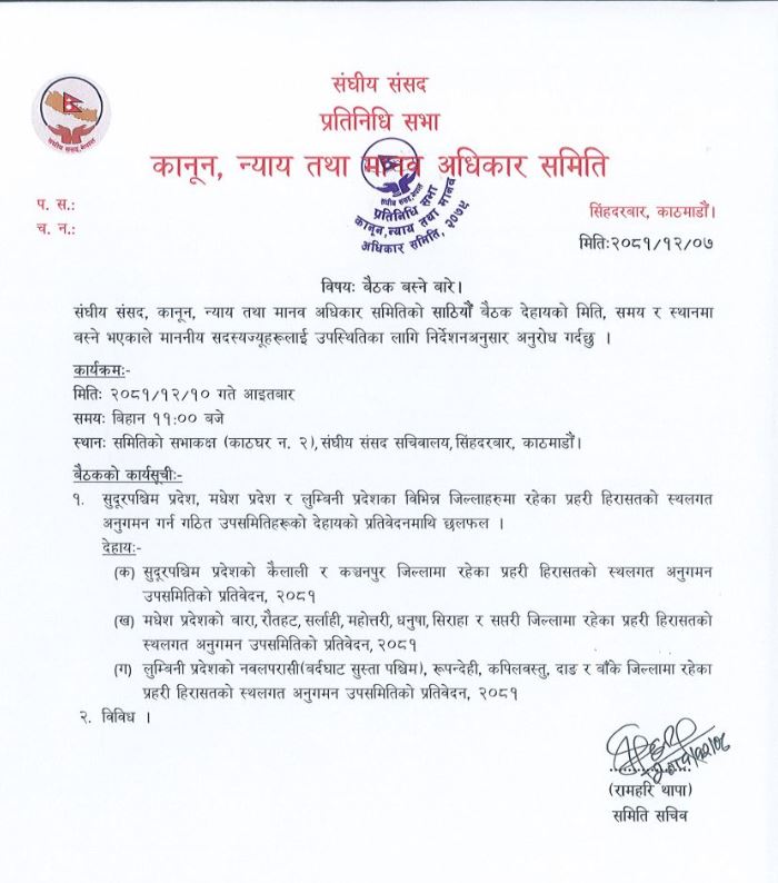 काठमाडौं । संघीय संसदका दुई समितिको बैठक बस्दैँछ । संघिय संसद सचिवालय सिंहदरबार परिसरमा ती बैठक बस्नेछन् । सचिवालयका अनुसार आज कानून, न्याय तथा मानव अधिकार समितिको बैठक बिहान ११ः०० बजे देखी सुरू हुनेछ भने शिक्षा, स्वास्थ्य तथा सूचना प्रविधि समितिको बैठक पनि बिहान ११ः०० बजे बोलाइएको छ । जुन बैठकमा शहीद दशरथ चन्द स्वास्थ्य विज्ञान विश्वविद्यालय विधेयक, २०८० माथि दफावार छलफल हुने जनाइएको छ ।