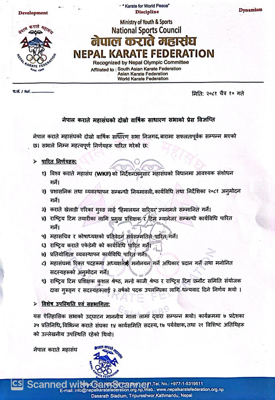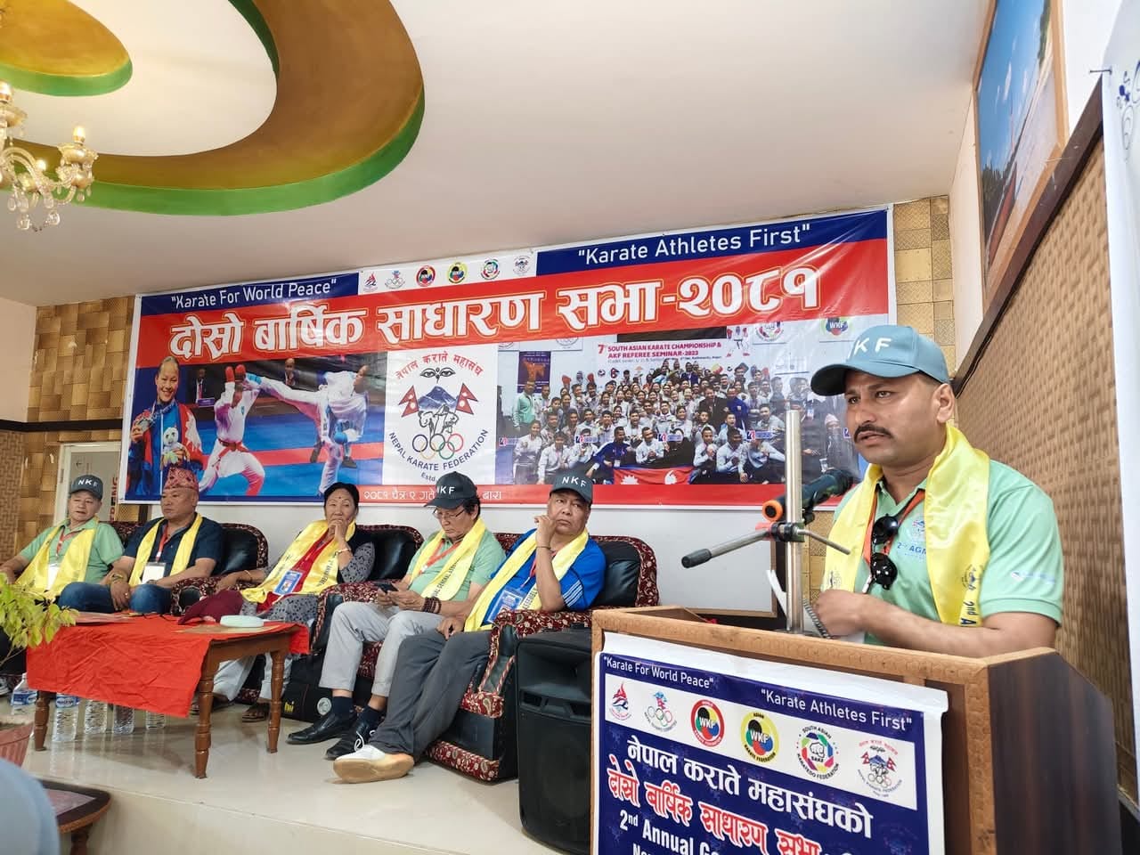 बारा । नेपाल कराते महासंघले कराते खेलाडी एरिका गुरुङ लाई ‘हिमालयन वारियर’ उपनामले सम्मानित गर्ने घोषण गरेको छ । मधेस प्रदेशस्थित निजगढमा सम्पन्न भएको दोस्रो साधारण सभाले कराते खेलाडी एरिका गुरुङलाई ‘हिमालयन वारियर’ उपनामबाट सम्मानित गर्ने घोषण गरिएको हो ।महासंघको साधारण सभाले विश्व कराते महासंघको निर्देशन अनुसार महासंघको विधानमा आवश्यक संशोधन गर्ने, प्रशासनिक तथा व्यवस्थापन सम्बन्धी नियमावली, कार्यविधि तथा निर्देशिका २०८१ अनुमोदन गर्ने निर्णय गरेको महासंघका कोषाध्यक्ष किशोरप्रसाद भट्टराईले बताए । कोषाध्यक्ष भट्टराईका अनुसार उक्त सभाबाट राष्ट्रिय टिम तयारीका लागि प्रमुख प्रशिक्षक र टिम म्यानेजर सम्बन्धी कार्यविधि, राष्ट्रिय कराते एकेडेमीको कार्यविधि र प्रतियोगिता व्यवस्थापन कार्यविधि पारित गर्ने निर्णय समेत गरिएको छ ।यस्तै महासंघमा रिक्त पदहरूमा अध्यक्षलाई मनोनयन गर्ने अधिकार प्रदान गरेको छ भने राष्ट्रिय टिम प्रशिक्षक कुशल श्रेष्ठ, मन्डे काजी श्रेष्ठ र राष्ट्रिय टिम छनौट समिति संयोजक दावा गुरुङ्ग र सदस्यहरूलाई २ वर्षको पदक उपलब्धिका लागि धन्यवाद समेत सभाले व्यक्त गरेको हो । सभाले महासचिव र कोषाध्यक्षको प्रस्तुत गरेको प्रतिवेदन समेत सर्वसम्मतिबाट पारित गरिएको छ । महासंघका अध्यक्ष युवराज लामाले भावी योजना, तर्जुमा कार्यक्रम र रणनैतिक योजनाहरु सहित कराते खेलले हाशिल गरेको उपलब्धिहरु सबैको योगदानले प्राप्त भएको बताए । कार्यक्रममा ७ प्रदेशका ३५ प्रतिनिधि, विभिन्न कराते संघका १४ कार्यसमिति सदस्य, १७ पर्यवेक्षक, तथा २१ विशिष्ट अतिथिहरूको उपस्थिति रहेको थियो ।