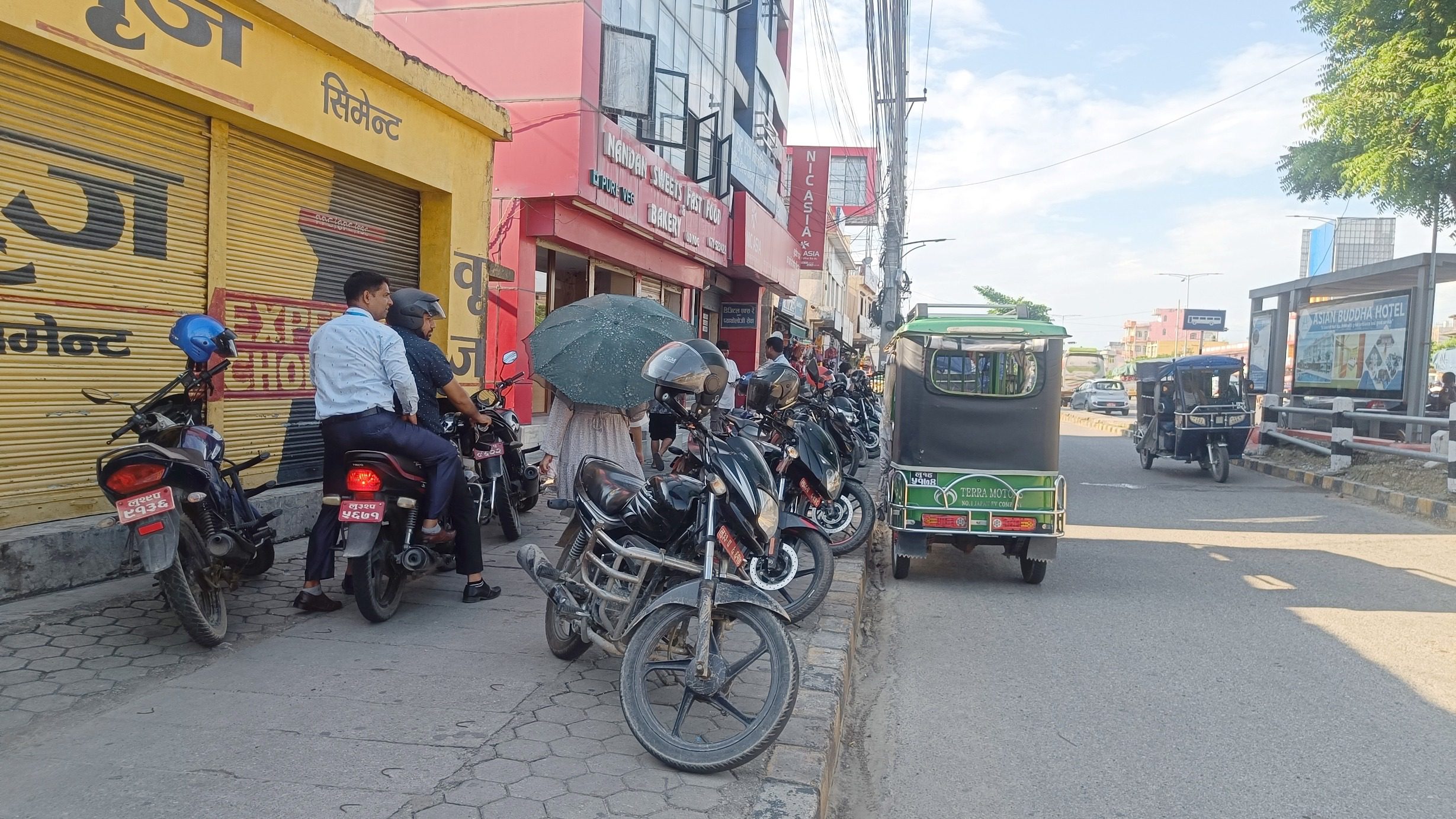 केवल पैदल यात्रुको सहजताका लागि बनाइने फुटपाथमा यहाँ मोटरसाइकलहरु क्रमबद्ध रुपमा पार्किङ गरि राखिएको छ । पछिल्लो केही दिन देखि फुटपाथ खाली गराउने र अव्यवस्थित पार्किङ्गमा कडाई गर्दै आएको सिद्धार्थनगर नगरपालिका र ट्राफिक प्रहरीले फुटपाथमै पार्किङ्ग गर्दा भने रमिते बनेको छ ।