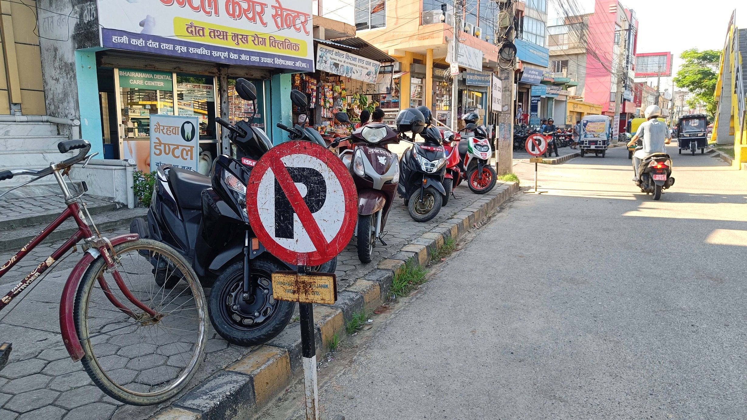 केवल पैदल यात्रुको सहजताका लागि बनाइने फुटपाथमा यहाँ मोटरसाइकलहरु क्रमबद्ध रुपमा पार्किङ गरि राखिएको छ । पछिल्लो केही दिन देखि फुटपाथ खाली गराउने र अव्यवस्थित पार्किङ्गमा कडाई गर्दै आएको सिद्धार्थनगर नगरपालिका र ट्राफिक प्रहरीले फुटपाथमै पार्किङ्ग गर्दा भने रमिते बनेको छ ।