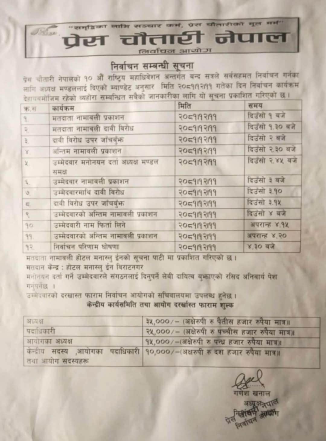 पार्टीको बचाऊमा कार्यकर्ताभन्दा बढी सक्रिय रहने चौतारीको अध्यक्षका लागि उम्मेदवारी दिँदा ३५ हजार तिर्नुपर्छ।यस्तै, पदाधिकारीले २५ हजार, आयोगका अध्यक्षले १५ हजार र केन्द्रीय सदस्य तथा आयोगका सदस्यहरूले १० हजार रुपैयाँ तिर्नुपर्ने छ।निर्वाचन परिणाम अपराह्न साढे ४ बजे घोषणा गरिने कार्यतालिका छ। निर्वाचनको कार्यक्रम विराटनगरको होटल मनास्लुमा राखिएको छ।