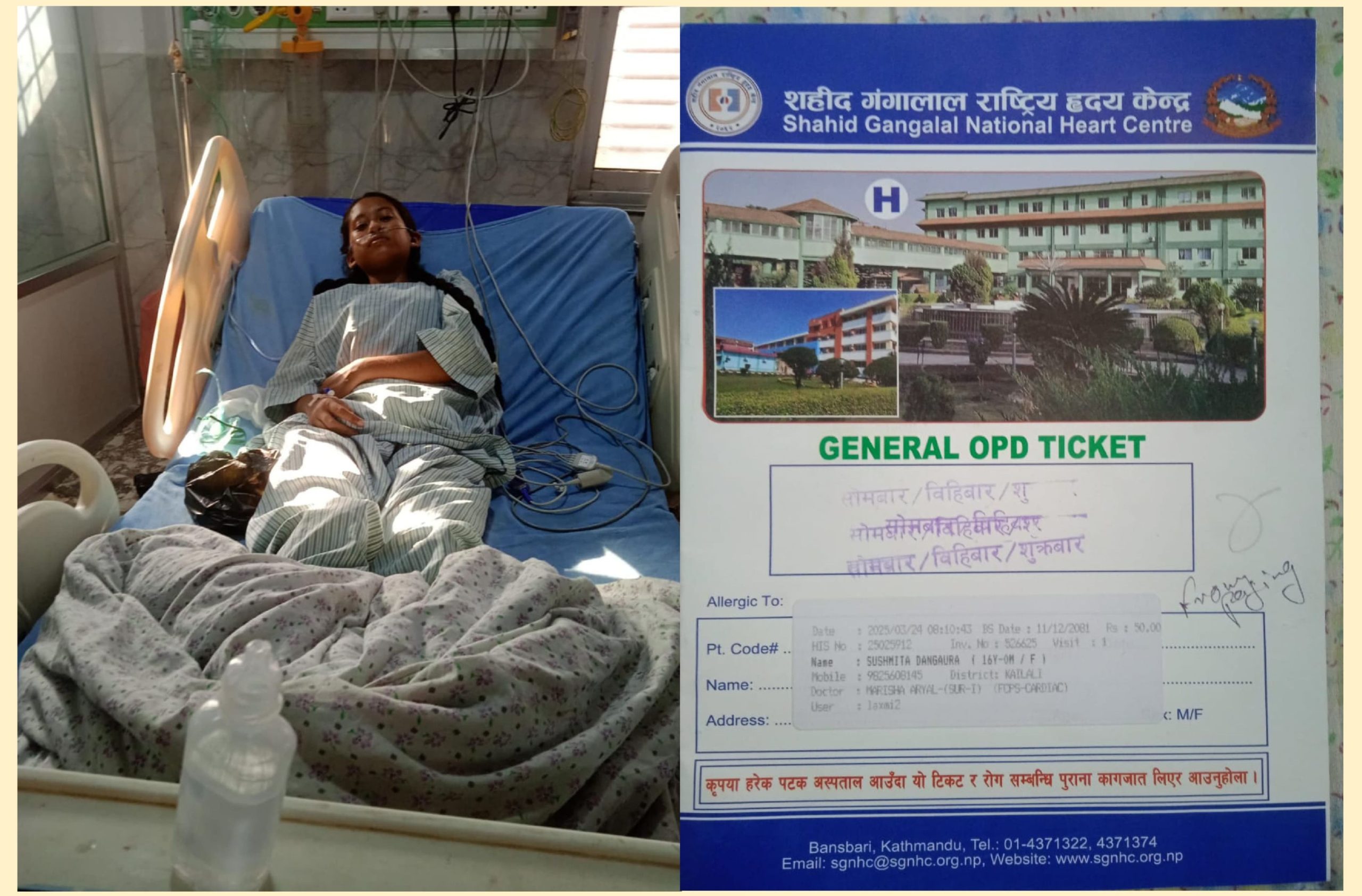 “बहिनी बिरामी भएपछि नेपालगन्ज लियौ । त्यहाँ उपचार गर्दा करिब डेढ लाख सकियो । लास्टमा यहाँ हुँदैन भनेर काठमाडौँ पठाइदियो । यता अस्पतालले बहिनीको मुटुमा प्वाल भएकाले अप्रेसन गर्नु पर्ने र करिब ५ लाख खर्च लाग्ने भनेको छ । डेढ लाख जति नेपालगन्जमै सकियो । अब पैसा नभएर अप्रेसन रोकिएको छ ।” सुस्मिताका दाजु बालकिसन डगौराले भने ।