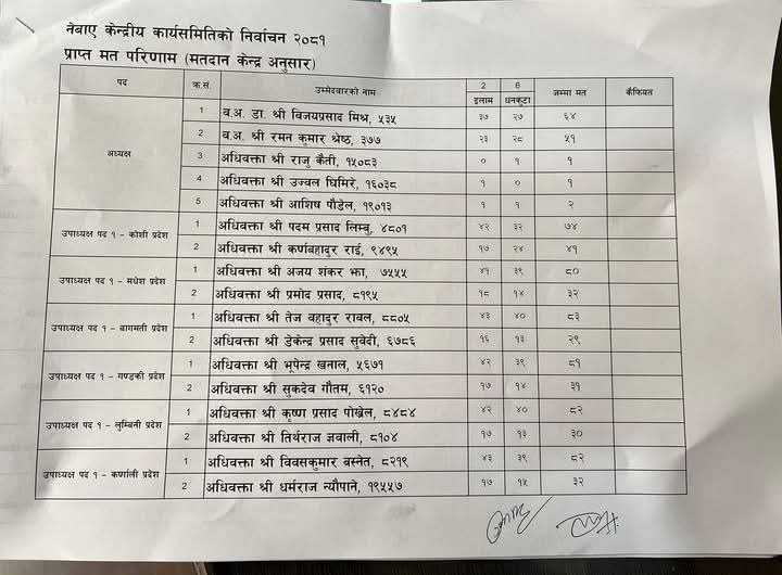 काठमाडौं । नेपाल बार एशोसिएसको निर्वाचनमा बिजयकुमार मिश्रले अग्रता जारी रहेको छन् । जारी मतगणनाको प्रारम्भिक रिपोर्ट अनुसार काठमाडौं, बिराटनगर, धनकुटा, सुनसरी, मोरङलगायतका मतदान केन्द्रको मतगणना हुदाँ मिश्रले अग्रता लिईरहेका हुन् । काठमाडौंमा मिश्रको ६४ मत प्राप्त हुदाँ श्रेष्ठले ५१ मत पाएको आधिकारिक घोषणा गरिएको छ।