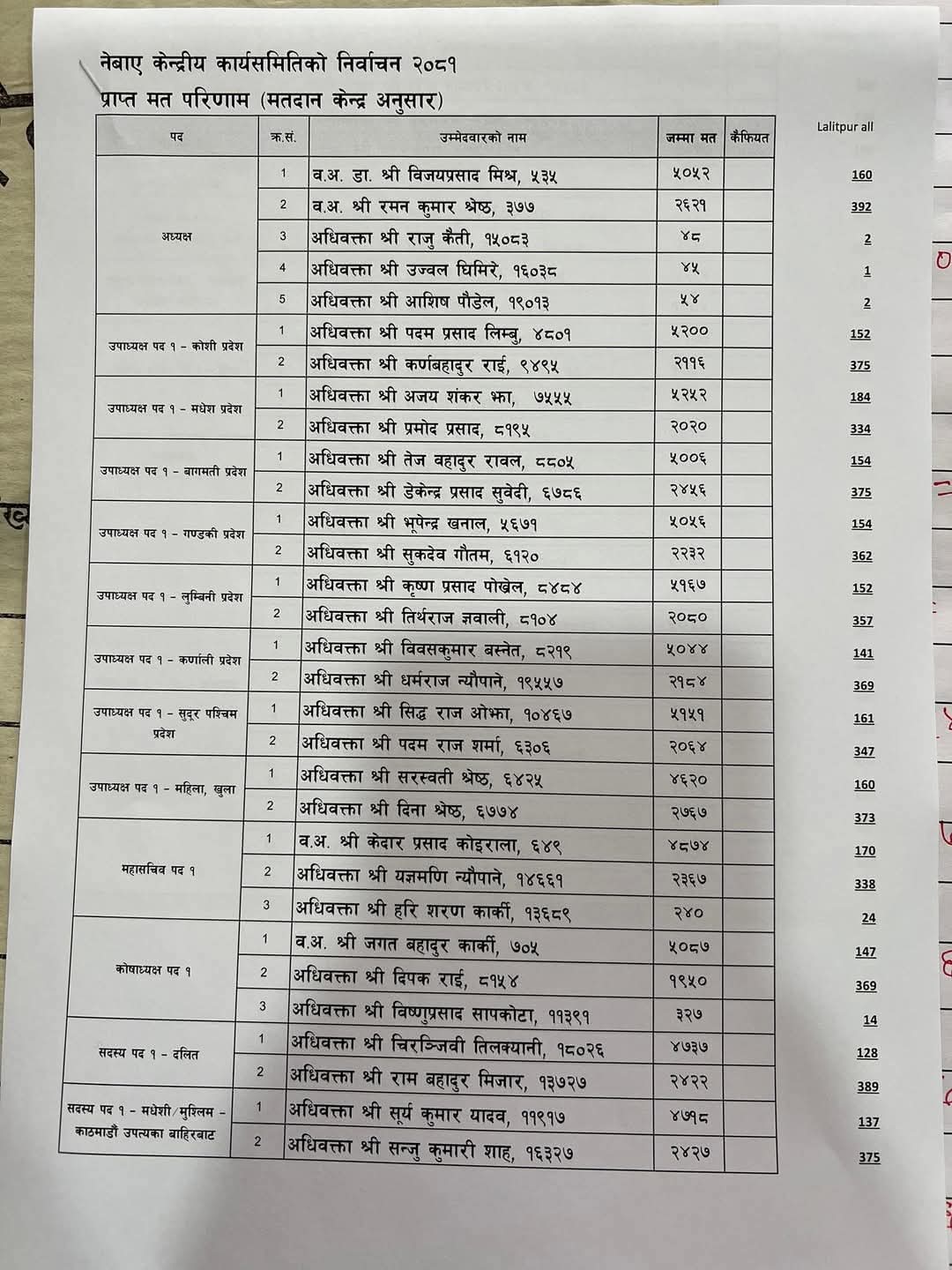 गत शनिवार सम्पन्न निर्वाचनको मतगणना बिहिबार सम्पन्न भए पछि बरिष्ठ अधिवक्ता मिश्रले प्रतिस्पर्धी उम्मेदवार भन्दा २ हजार ४३१ मत बढीसहित ५ हजार ५२ मतसहित विजयी भएका हुन । उनका निकटतम प्रतिस्पर्धी विपक्षी गठबन्धनबाट भिडेका नेकपा माओवादी केन्द्र समर्थित बरिष्ठ अधिबक्ता २ हजार ६२१ मतमा सिमित हुन पुगेका छन।त्यस्तै महासचिवमा कांग्रेस–एमाले प्यानलका केदारप्रसाद कोइराला ४ हजार ८७४ मत ल्याएर विजयी हुँदा यज्ञमणि न्यौपानेले २ हजार ३६७ मतमा सिमित भएका छन् ।