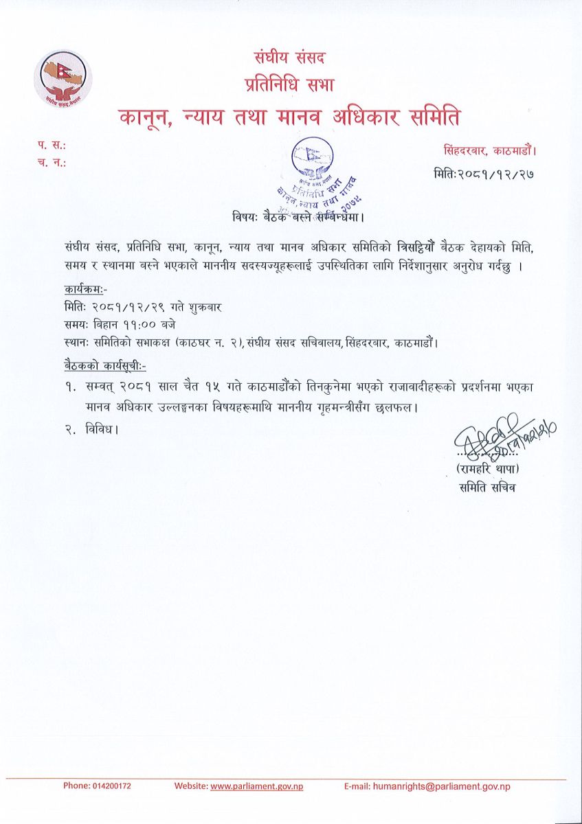 काठमाडौं। संघीय संसदको एक समितिले गृह मन्त्री रमेश लेखकसँग सोधपुछ गर्ने भएको छ। कानून, न्याय तथा मानव अधिकार समितिले गृह मन्त्री लेखकसँग चैत १५ गते भएको राजावादीहरूको प्रदर्शनका बारेमा सोधपुछ गर्ने भएको हो । समिति सचिवालयका अनुसार २०८१ साल चैत १५ गते काठमाडौंको तीनकुनेमा भएको राजावादीहरूको प्रदर्शनमा भएका मानवअधिकार उलङघनका बिषयहरू माथी माननीय गृहमन्त्रीसँग छलफल हुनेछ । जुन बैठक बिहान ११ः०० बजे बोलाइएको छ ।