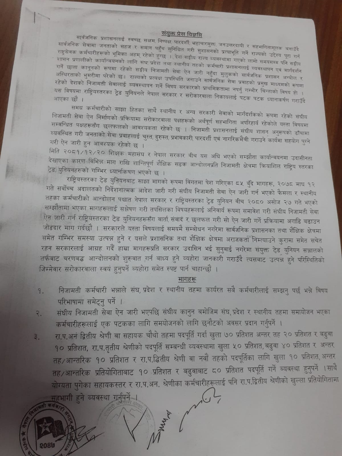 आज काठमाडौंमा एक पत्रकार सम्मेलन गरी ६ वटा ठुला साना संगठनले निजामती क्षेत्रका माग अबिलम्ब पूरा नगरे चरणवद्ध आन्दोलनको चेतावनी दिएका हुन । यसअघिका मागसमेत जोडेर उनीहरूले चरणबद्द आन्दोलनमा जाने घोषणा गरेका हुन् ।