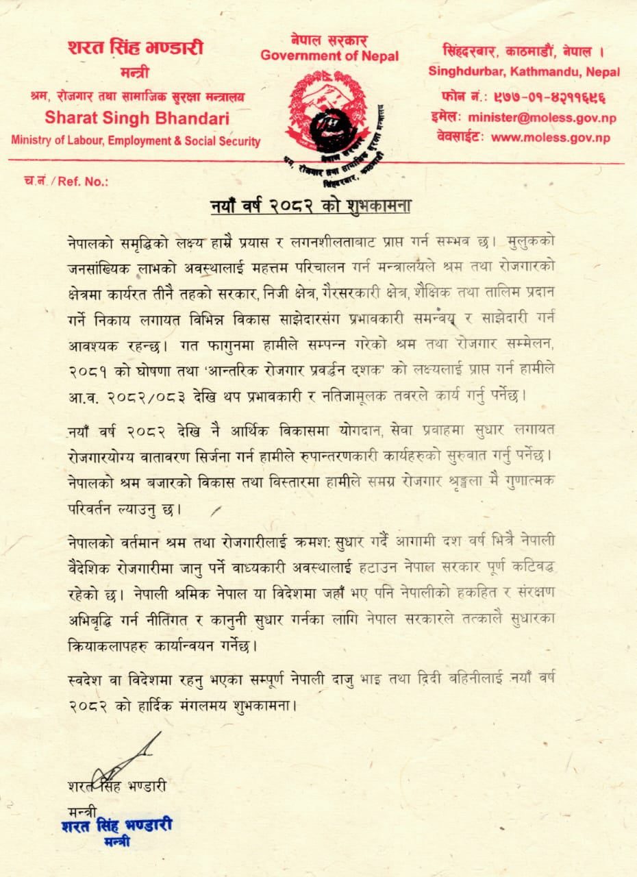 त्यसै गरी, नयाँ वर्ष २०८२ देखि नै आर्थिक विकासमा योगदान गर्ने, सेवा प्रवाहमा सुधार गर्ने लगायत रोजगारयोग्य वातावरण सिर्जना गर्न मन्त्रालयले जिम्मेवारीपूर्वक कार्य गर्ने योजना श्रम मन्त्री भण्डारीको शुभकामना सन्देशमा रहेको छ।