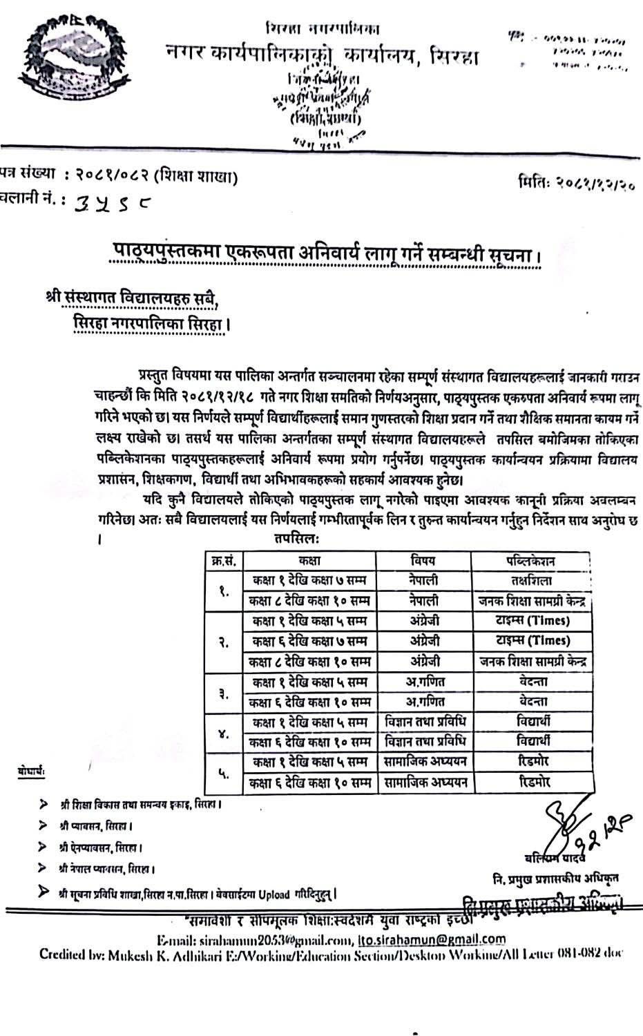 सिरहा नगरपालिकाका निमित्त प्रमुख प्रशासकीय अधिकृत बलिराम यादवको हस्ताक्षरमा जारी गरिएको पत्रमा पब्लिकेशनको नाम मात्रै तोकी दिएको छैन, यो निर्णय नगर शिक्षा समितिबाट भएकोले अवज्ञा गर्ने विद्यालयलाई कारबाही गर्ने चेतावनीसमेत दिइएको छ ।