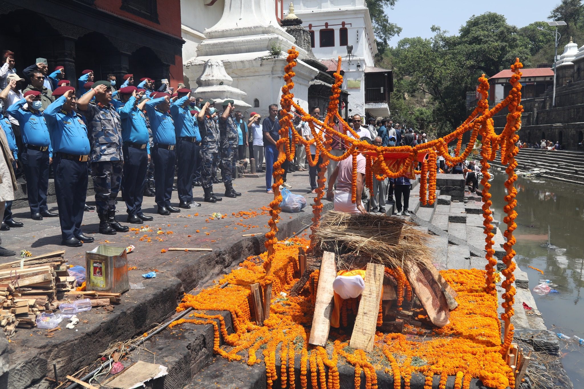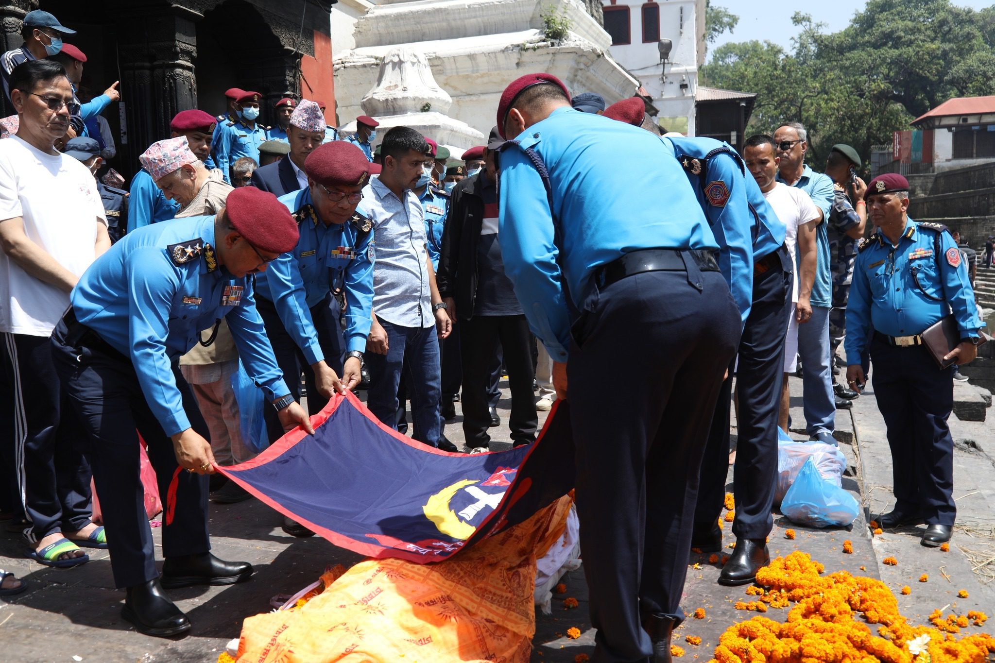 काठमाडौं । ९७ वर्षको उमेरमा वैशाख ९ गते दिवंगत हुनुभएका अवकाश प्राप्त प्रहरी महानिरीक्षक दुर्लभ कुमार थापाको पार्थिव शरीरलाई पशुपति आर्यघाटमा अन्तिम बिदाइ गरिएको छ ।श्रद्धाञ्जली समारोहमा प्रहरी महानिरीक्षक दिपक थापा, सशस्त्र प्रहरी महानिरीक्षक राजु अर्याल, अवकाश प्राप्त प्रहरी महानिरीक्षकहरू लगायतले थापाको पार्थिव शरीरमा फूलमाला चढाई अन्तिम भावपूर्ण श्रद्धाञ्जली अर्पण गरेका छन् ।