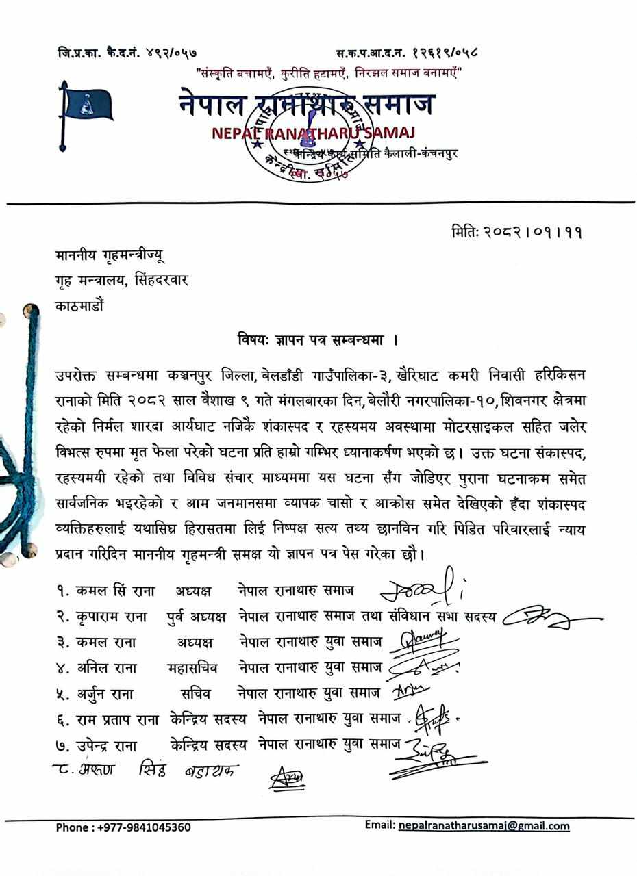 यही वैशाख ९ गते मंगलबार बिहान बेलौरी नगरपालिका-१० शिवनगरस्थित निर्मल शारदा आर्यघाट नजिकै हरिकिसन राना मोटरसाइकलसहित जलेको अवस्थामा मृत फेला परेका थिए । घटनालाई रहस्यमय र शङ्कास्पद मानिएको छ । ज्ञापन पत्रमा भनिएको छ, “उक्त घटना शङ्कास्पद, रहस्यमयी रहेको तथा विविध सञ्चारमाध्यममा यस घटनासँग जोडिएर पुराना घटनाक्रम समेत सार्वजनिक भइरहेका छन् । आम जनमानसमा व्यापक चासो र आक्रोश देखिएको हुँदा शङ्कास्पद व्यक्तिहरूलाई यथाशीघ्र हिरासतमा लिई निष्पक्ष छानबिन गरियोस् ।”
