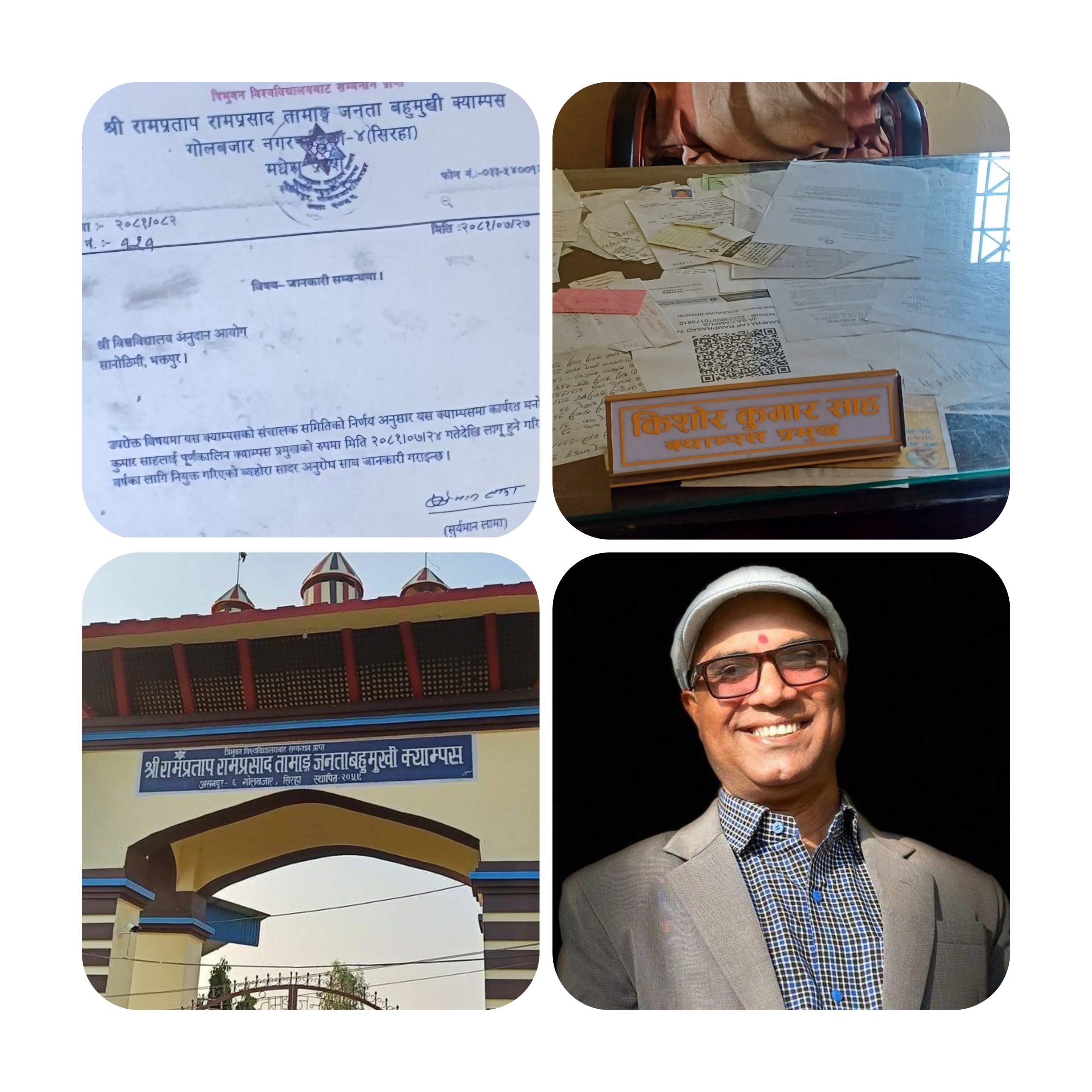 तर, क्याम्पस प्रमुख बनाइएका मनोज साह भने बेखबर छन्। उनी भन्छन्, ‘यो बिषयमा मलाई केही जानकारी छैन्। मलाई कसैले औपचारिक अनौपचारिक कुनैपनि रुपमा मैले जानकारी पाएको छैन्। क्याम्पस प्रमुख अहिले पनि किशोर साहजी नै हुनुहुन्छ ।’यस बिषयमा रामप्रसाद रामप्रताप तामाङ जनता बहुमुखी क्याम्पसका सञ्चालक समितिका अध्यक्ष सुर्य मान तामाङलाई अहिलेको क्याम्पस प्रमुख को हो? क्याम्पस प्रमुख फेरिएको छ कि छैन? भन्ने प्रश्नमा उनले भने, ‘अहिलेको क्याम्पस प्रमुख किशोर साह नै हुनुहुन्छ। हामिले अहिले सम्म उहाँलाई जिम्मा दिएका छौं।’