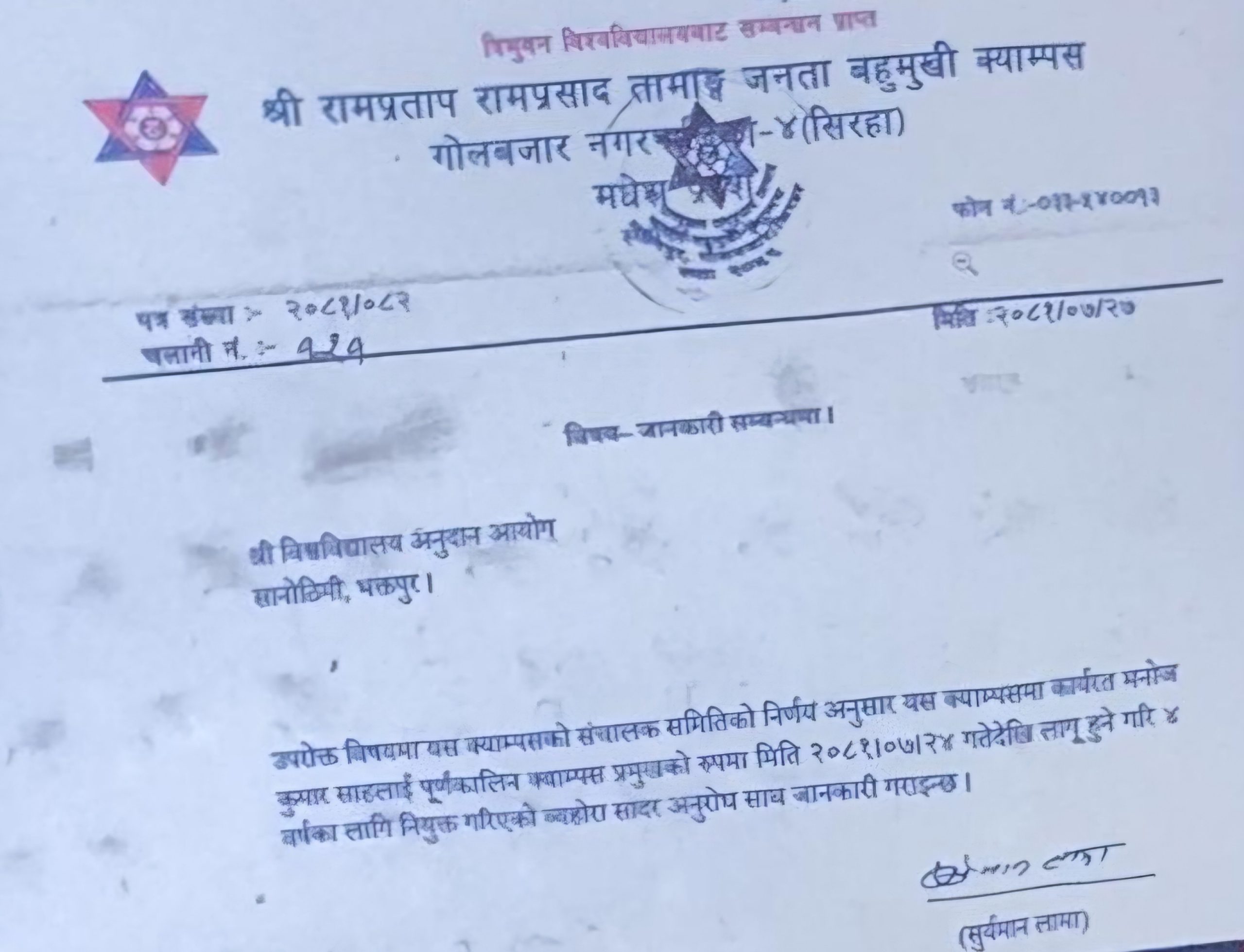 अनुदान आयोगका वरिष्ठ सहायक शिवचन्द पटेलले क्याम्पसको लेटरहेडमा नयाँ क्याम्पस प्रमुख नियुक्ति गरिएको पत्र आएको बताए। उनले भने, ‘हाम्रोमा मनोज कुमार साहलाई क्याम्पस प्रमख बनाएको आशयको पत्र आएको छ। त्यसका निर्णयहरु भने आई सकेको छैन।’