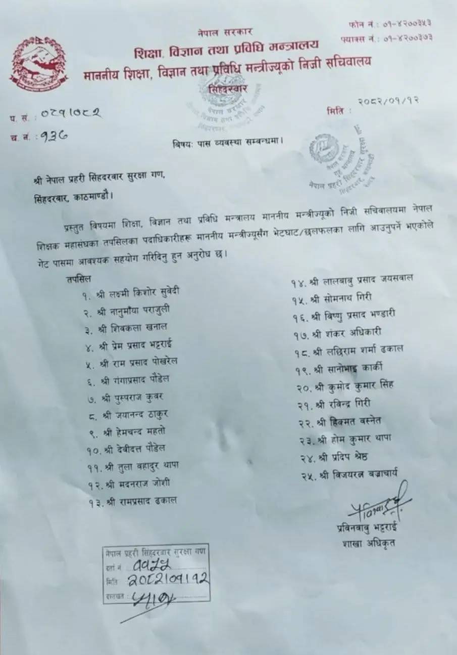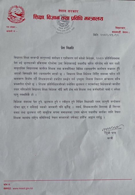 काठमाडौं। आन्दोलनरत शिक्षक महासंघ र सरकारबीच आज वार्ता हुने भएको छ । आज दिउँसो ३ः०० बजे सिंहदरवारस्थित कार्यालयमा उक्त बार्ता हुनेछ ।सरकारको तर्फबाट शिक्षा, विज्ञान तथा प्रविधि मन्त्री रघुजी पन्त, शिक्षा सचिव दिपक काफ्ले लगायत उपस्थित हुनेछन भने महासंघको तर्फवाट अध्यक्ष लक्ष्मीकिशोर सुवेदीलगायत पदाधिकारीको प्रतिनिधित्व हुनेछ । यद्दपी, सरकारले वार्तामा बोलाएपछि शिक्षक महासंघका नेताहरू आन्तरिक छलफलमा जुटेका छन् ।मन्त्रीमा नियु्क्त हुने बितिक्कै शिक्षा मन्त्री पन्तले आन्दोलनरत शिक्षकलाइ बार्तामा बोलाएका थिए । लगत्तै, उनीहरू बार्तामा बस्न तयार भएका हुन् ।