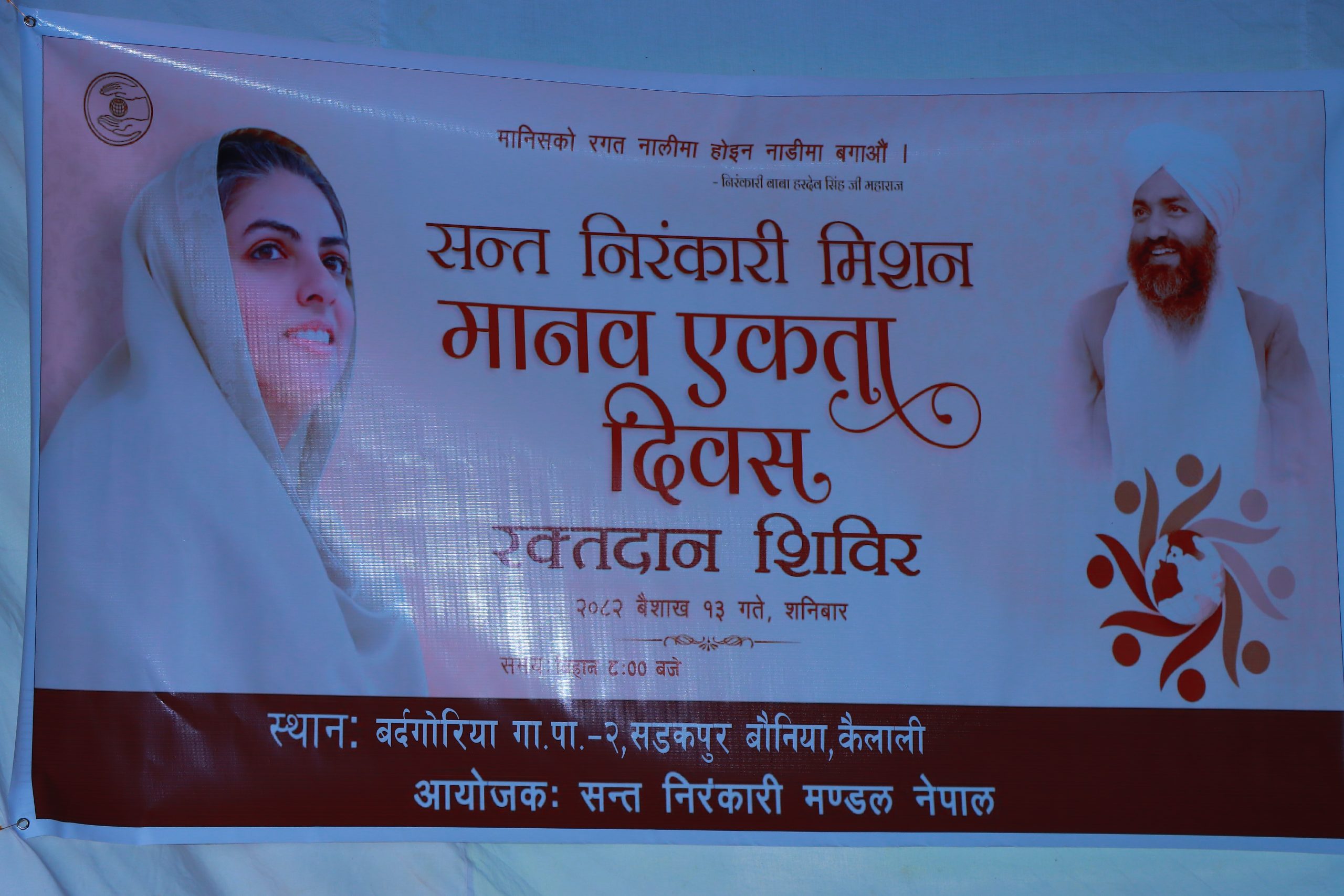 कैलाली । कैलाली जिल्लाको बर्दगोरिया गाउँपालिका वडा नं २ मा रहेको सन्त निरंकारी मण्डल नेपाल सत्संग भवन सडकपुर बौनियाँ शाखाले शनिबार (आज) मानव एकता दिवस मनाएको छ । दिवसको अवसरमा सडकपुर बौनियाँ शाखाले सत्संग भवनमामा रक्तदान कार्यक्रम समेत गरेको हो । ‘मानिसको रगत नालीमा होइन नाडीमा बगाऔँ’ भन्ने नाराका साथ कार्यक्रम गरेको हो ।