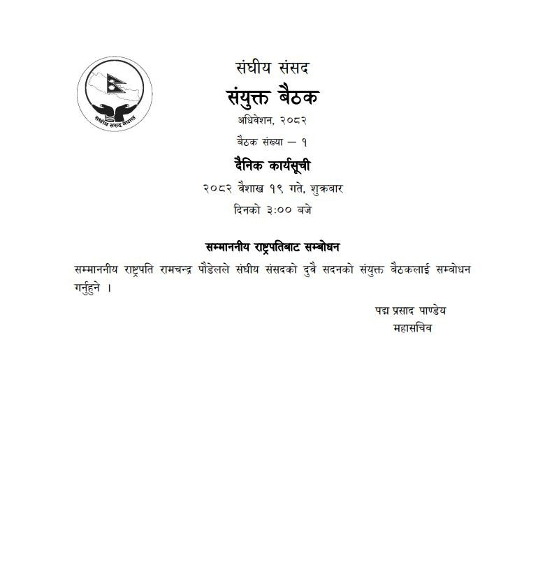 काठमाडौं । संघीय संसदका दुवै सदनको संयुक्त बैठक बस्दैँछ । सरकारले आज आर्थिक बर्ष २०८२÷८३ का लागि नीति तथा कार्यक्रम सार्बजनिक गर्दैछ । जसअनुसार राष्ट्रपति रामचन्द्र पौडलले सरकारको नीति तथा कार्यक्रम बाचन गर्दैछन् । बैठक दिनको ३ः०० बजेवाट सुरू हुनेछ ।