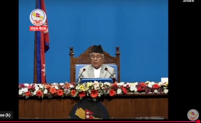 प्रतिनिधि सभा र राष्ट्रिय सभाको संयुक्त बैठकलाई राष्ट्रपति रामचन्द्र पौडेल बैठकमा नेपाल सरकारको नीति तथा कार्यक्रम प्रस्तुत गरिरहेका छन् । तस्विरः दिनेश बुढाथाेकी र प्रदिपराज पन्त