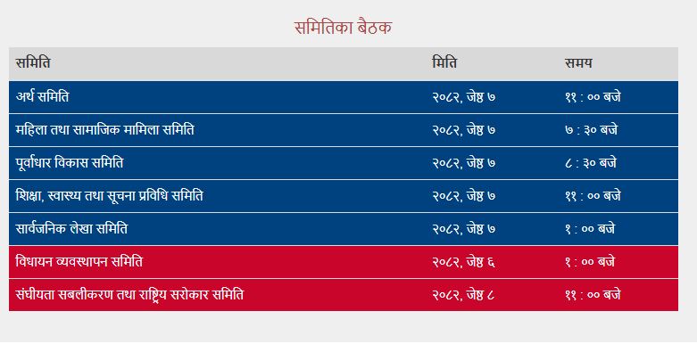 उता, महिला तथा सामाजिक मामिला समितिको बैठकमा दुई वटा उपसमितिहरुले तयार पारेका प्रतिवेदनहरु समिति समक्ष पेश गर्नेका लागि बिहान ७ः३० बजेबाट नै बैठक सुरू गरिनेछ भने पूर्वाधार विकास समितिको बैठकमा विद्युत विधेयक, २०८० माथि संशोधन सहित दफाबार छलफल गरिने भएको छ। साथै, शिक्षा, स्वास्थ्य तथा सूचना प्रविधि समितिको बैठकमा विद्यालय शिक्षा विधेयक,२०८० को सम्बन्धमा उपसमितिको प्रतिवेदन माथि छलफल गरिनेछ । जुन बैठक बिहान ११ः०० बजेबाट सुरू हुनेछ ।