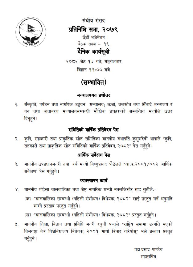 सम्भावित कार्यसूची अनुसार संस्कृति, पर्यटन तथा नागरिक उड्डयन मन्त्रालय, ऊर्जा, जलस्रोत तथा सिँचाइ मन्त्रालय र वन तथा वातावरण मन्त्रालयसम्बन्धी मौखिक प्रश्नको सम्बन्धित मन्त्रीले उत्तर दिने कार्यसूचीसमेत तय भएको छ । साथै महिला बालबालिका तथा ज्येष्ठ नागरिकमन्त्री नवलकिशोर साह सुडीले ‘बालबालिकासम्बन्धी (पहिलो संशोधन) विधेयक, २०८२’ प्रस्तुत गर्नेछन् । उता, शिक्षा विज्ञान तथा प्रविधिमन्त्री रघुजी पन्तले ‘राष्ट्रियसभामा उत्पत्ति भएको तिलगङ्गा नेत्र विश्वविद्यालय विधेयक, २०८१ विधेयकमाथि विचार गरियोस्’ भन्ने प्रस्ताव प्रस्तुत गर्नेछन् ।