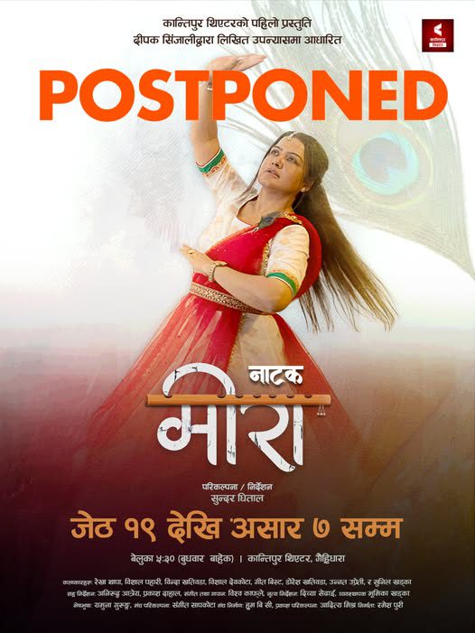 काठमाडौं । रेखा थापा अभिनित नाटक ‘मीरा’ पोस्टपोण्ड भएको छ ।\आजको असहज राजनितीक परिस्थितीका कारण हामीले आजको लागि तय गरिएको ‘कान्तिपुर थिएटर’ को उद्घाटन तथा नाटक ‘मीरा’ को प्रिमीयर दर्शक, कलाकार तथा अतिथीहरुको सुझाव र सुरक्षालाई मध्यनजर गर्दै हाललाई स्थगित गरिएको जनाइएको  छ।