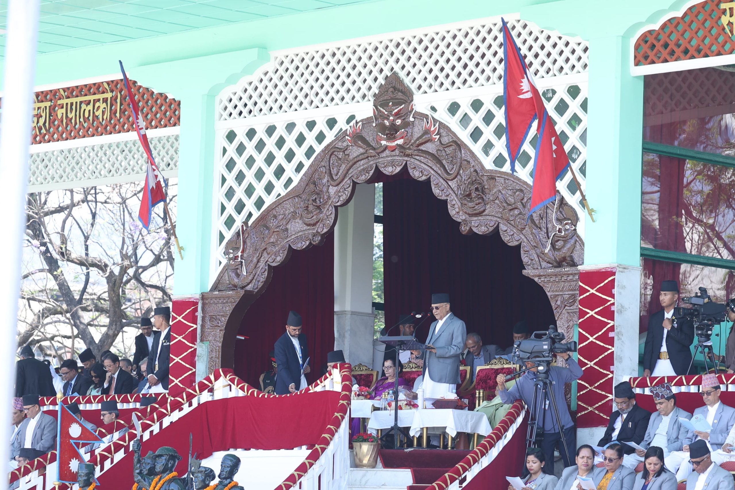 काठमाडौं । राष्ट्रपति रामचन्द्र पौडेल गणतन्त्र दिवस मूल समारोह समितिद्वारा सैनिक मञ्च टुँडिखेलमा बिहीबार  आयोजित विशेष समारोहमा  सरिक भएका छन ।त्यस अवसरमा राष्ट्रपतिको सम्मानमा नेपाली सेनाद्वारा सलामी अर्पण गरिएको थियो । कार्यक्रममा राष्ट्रिय गान र झण्डोत्तोलन गरिएको थियो । साथै सो अवसरमा  सहिदप्रति श्रद्धाञ्जली अर्पण गर्दै लोकतन्त्रका लागि सङ्घर्ष, त्याग र बलिदान गर्ने अग्रजको योगदानको स्मरण गरियो ।