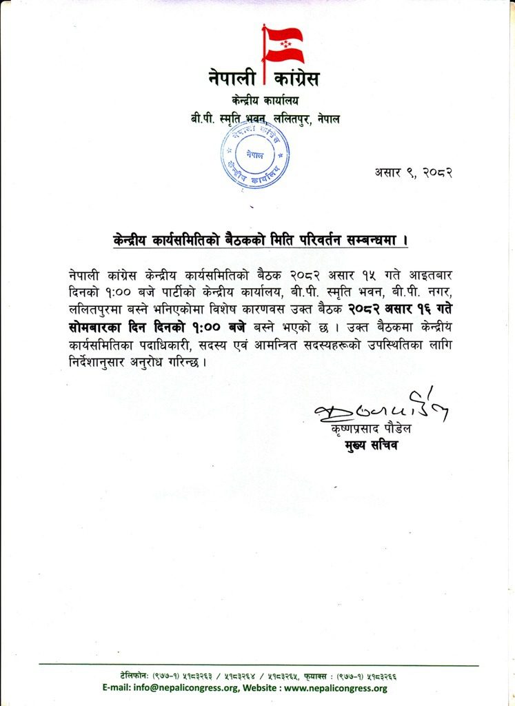काठमाडौं । आजवाट नेपाली कांग्रेसको केन्द्रिय कार्यसमितिको बैठक बस्दैँछ ।सानेपा, बिपीनगरस्थित केन्द्रिय कार्यालयमा उक्त बैठक बस्नेछ । सो बैठक दिउँसो १ः०० बजेवाट सुरू हुनेछ ।आज देखि सुरु हुने केन्द्रीय कार्यसमिति बैठकका एजेन्डासमेत तय गरिएको छ । हिजो पार्टी सभापति शेर बहादुर देउवा निवास बुढानीलकण्ठमा बसेको कांग्रेस पदाधिकारी तथा पूर्वपदाधिकारी बैठकले केन्द्रीय कार्यसमिति बैठकका एजेन्डा तय गरेको हो ।