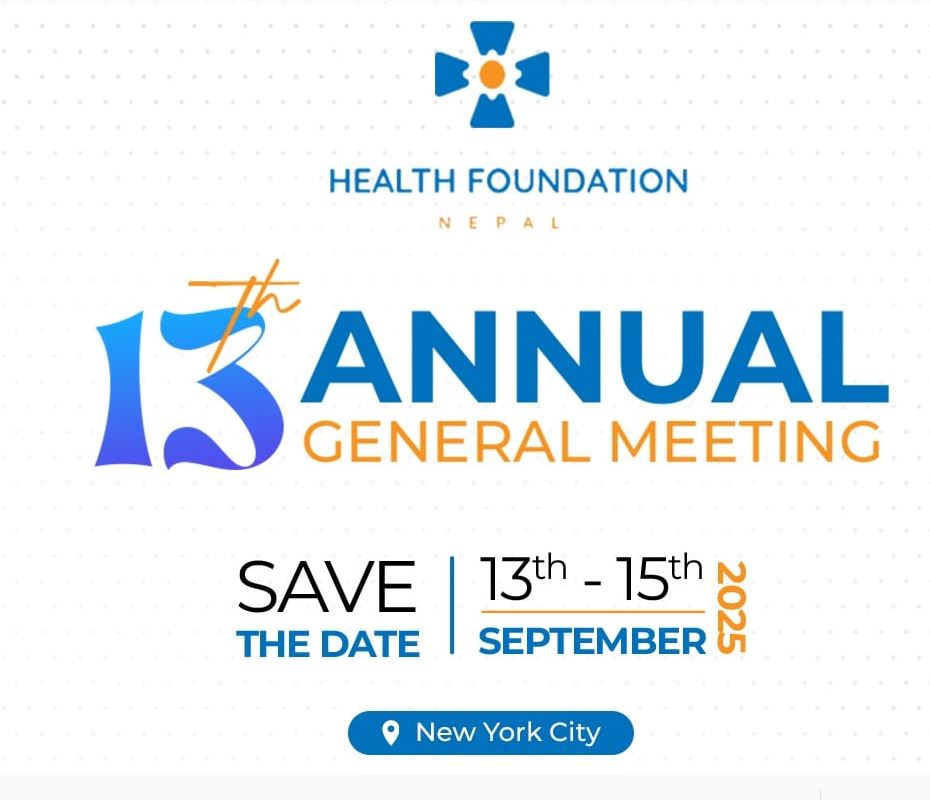 काठमाडौं । हेल्थ फाउण्डेसन नेपाल, युएसए (एचएफएन) को १३ औं सम्मेलन अमेरिकाको न्युयोर्कमा हुने भएको छ । फाउण्डेसनका डाइरेक्टर डा. आदित्य जोशीका अनुसार आगामी सेप्टेम्बर १३ देखि १५ सम्म तीन दिन हुने सो सम्मेलनमा नेपाल र अमेरिकाबाट चिकित्सक तथा स्वास्थ्य क्षेत्रका विज्ञहरुले भाग लिनेछन् ।