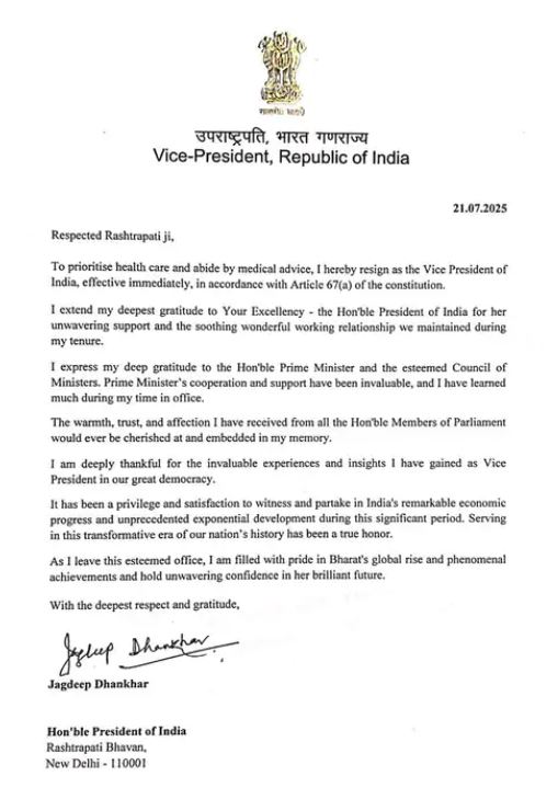 धनखरले धारा ६७ (ए) बमोजिम राष्ट्रपति द्रौपदी मुर्मुलाई राजीनामा पत्र बुझाइसकेको जनाएका हुन् । उनले राजिनामा पत्रमा लेखेका छन् – ‘स्वास्थ्य र चिकित्सा सल्लाहलाई प्राथमिकता दिँदै तत्काल प्रभावबाट भारतको उपराष्ट्रपति पदबाट राजीनामा दिँदैछु ।’ पत्रमा उनले सहयोग र सौहार्दपूर्ण सम्बन्धका लागि राष्ट्रपतिलाई धन्यवाद दिएका छन् । साथै, सहयोगका लागि प्रधानमन्त्री र मन्त्रिपरिषद्लाई धन्यवाद पनि दिए । तर, उनको राजीनामा राष्ट्रपतिले स्वीकृत गरेपछि मात्र लागू हुनेछ ।