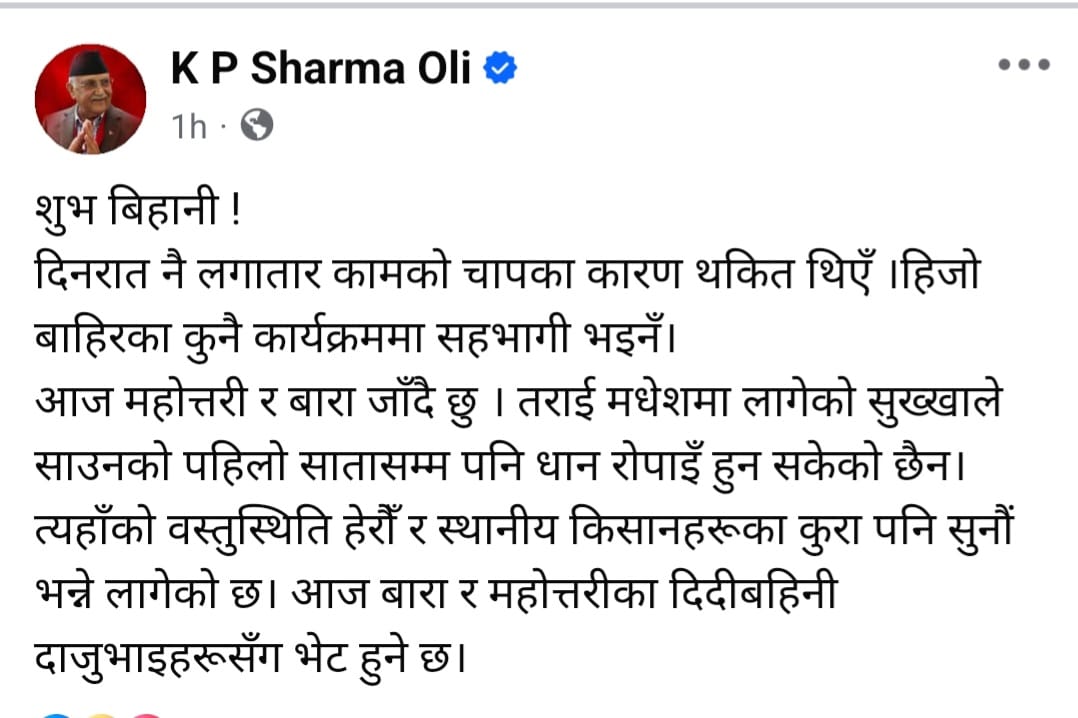 प्रधानमन्त्री ओलीले सामाजिक सञ्जालमार्फत भनेका छन,‘साउनको पहिलो सातासम्म पनि धान रोपाइँ हुन सकेको छैन। त्यहाँका वस्तुस्थिति हेरौं र स्थानीय किसानका कुरा सुनौं भन्ने लागेको छ। आज महोत्तरी र बाराका दिदीबहिनी दाजुभाइहरूसँग भेट हुने छ।’
