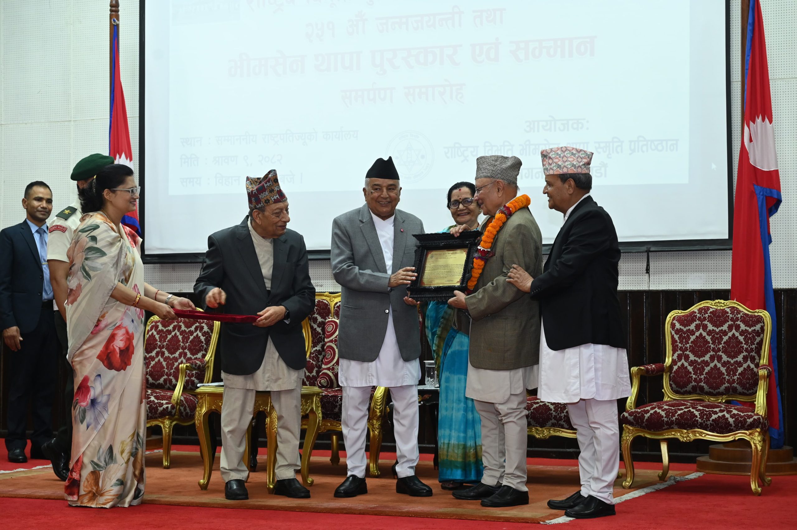 उनले भने, ‘उहाँको राष्ट्र«प्रतिको प्रेम, प्रशासनिक क्षमता र राजनीतिक दूरदर्शिताको कारणले नै मुलुक स्वतन्त्र र अटल रुपमा रहन सकेको हो । थापाले आर्थिक, प्रशासनिक, सैनिक, सामाजिक सुधारलगायत राष्ट्रको हित, प्रगति र विकासको लागि गर्नुभएको योगदान सदैव सराहनीय छ । त्यसैले नेपालको इतिहासमा भीमसेन थापाको स्थान उच्च रहेको स्पष्ट हुन्छ ।’सो क्रममा राष्ट्रपति पौडेलले कुटनीतिज्ञ भेषबहादुर थापालाई यसवर्षको भीमसेन थापा पुरस्कार प्रदान गरेका थिए ।