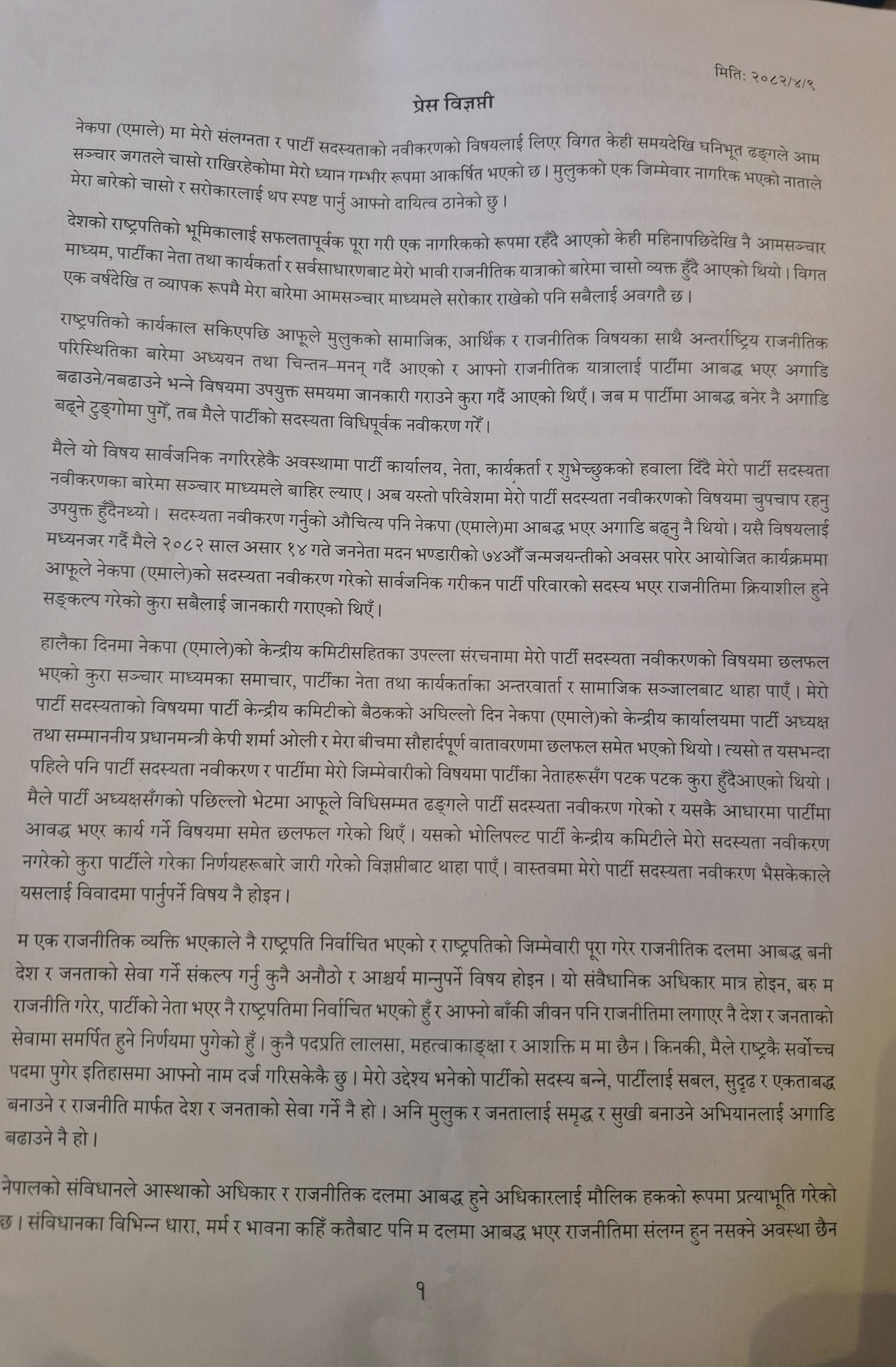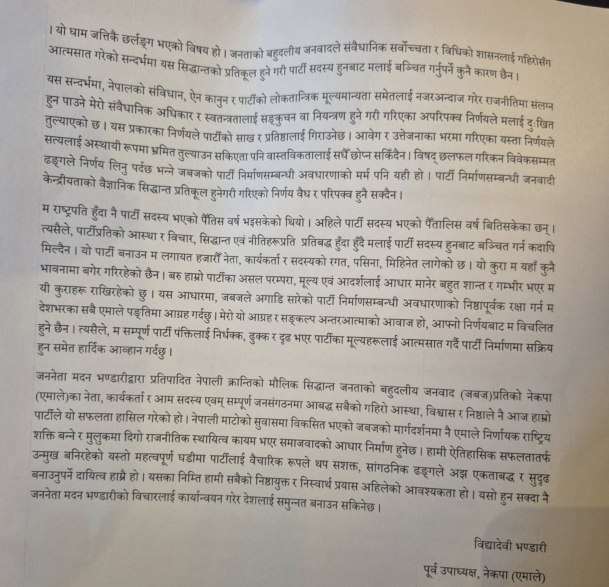 ‘मेरो पार्टी सदस्यता नवीकरण भइसकेकाले यसलाई विवादमा पार्नुपर्न विषय नै होइन, मैले बोलेको पनि थिइन, सञ्चारमाध्यममा ल्याइए पछि यो कुरा बोल्न बाध्य भएको हुँ’ उनले भनिन्। एमालेको सदस्यको रूपमा ४५ वर्ष देखी काम गरिरहेको जनाउँदै उनले फेरी पार्टी प्रति प्रतिबद्द भएको जानकारी दिइन । ‘त्यसैले पार्टीप्रतिको आशा र सिद्धान्त र राष्ट्रप्रति कटिबद्ध हुँदाहुँदै मलाई पार्टी सदस्यताबाट बञ्चित गर्न कदापि पनि मिल्दैन,’ उनले भनिन्।‘म सबै साथीहरूलाई पार्टीका मूल्यहरूलाई आत्मसात् गर्दै पार्टी निर्माणमा सक्रिय हुनका लागि आग्रह गर्दछु,’ उनले भनिन्, ‘पार्टी बनाउन म र मजस्ता हजारौंको हात छ।’