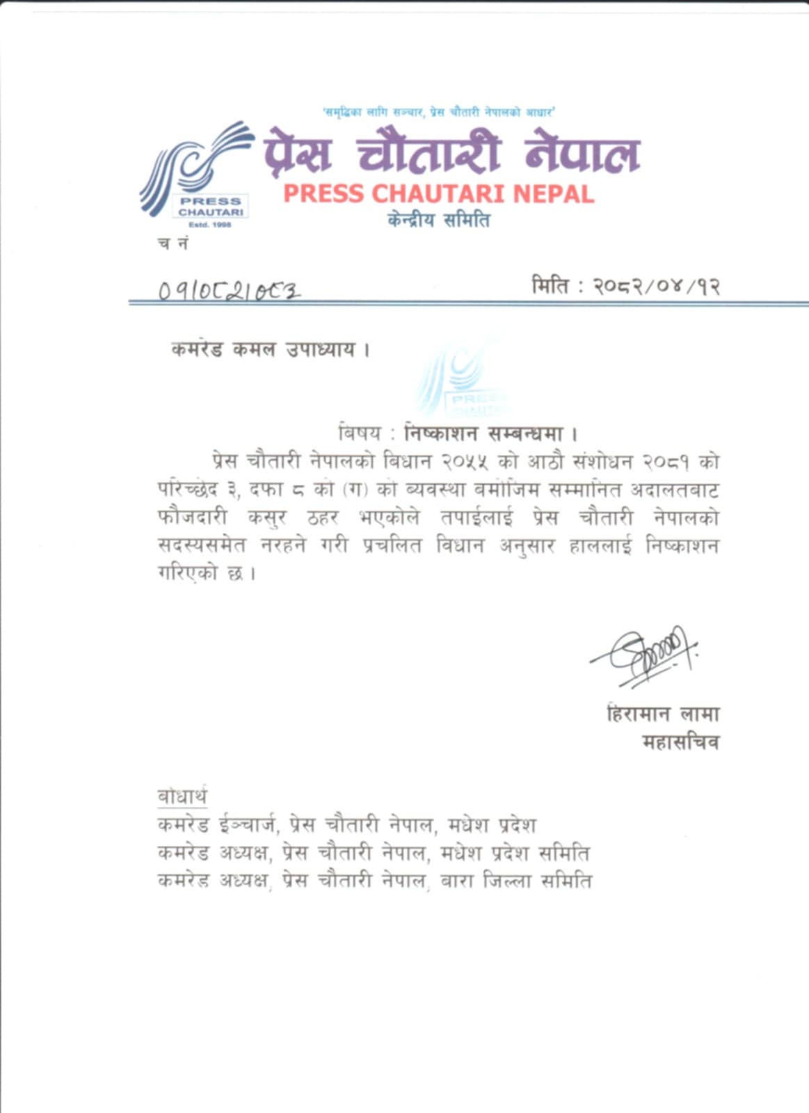 काठमाडाैं । फौजदारी अपराधमा विशेष अदालतबाट दोषी ठहरिएपछि मधेश प्रदेश प्रेस काउन्सिलका अध्यक्ष कमलकुमार उपाध्यायलाई प्रेस चौतारी नेपालले संगठनबाट निष्काशन गरेको छ।प्रेस चौतारी नेपालका महासचिव हिरामान लामाले विज्ञप्ति जारी गर्दै उपाध्यायको साधारण सदस्यता समेत नरहने गरी निष्काशन गरिएको जानकारी दिएका हुन्।