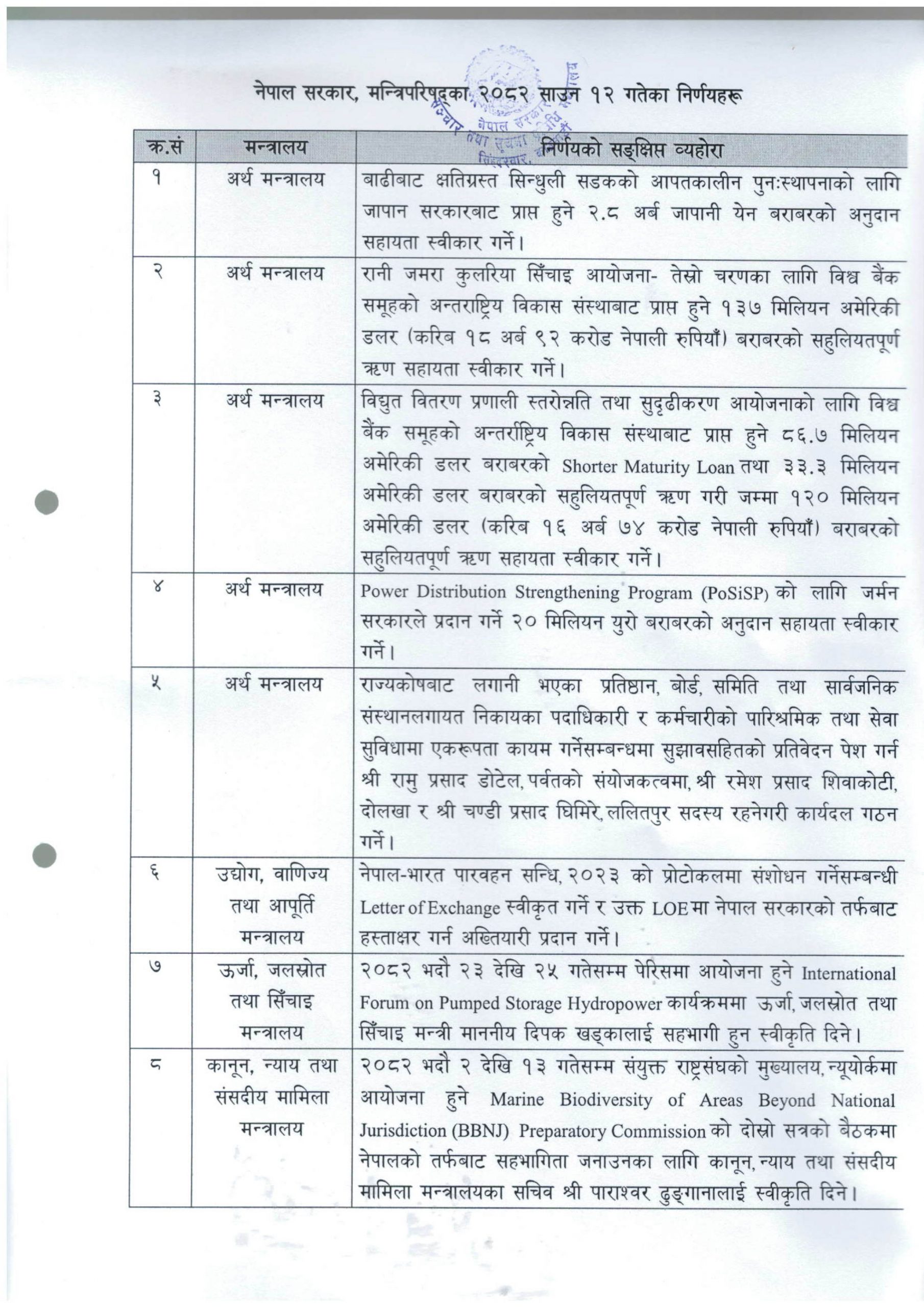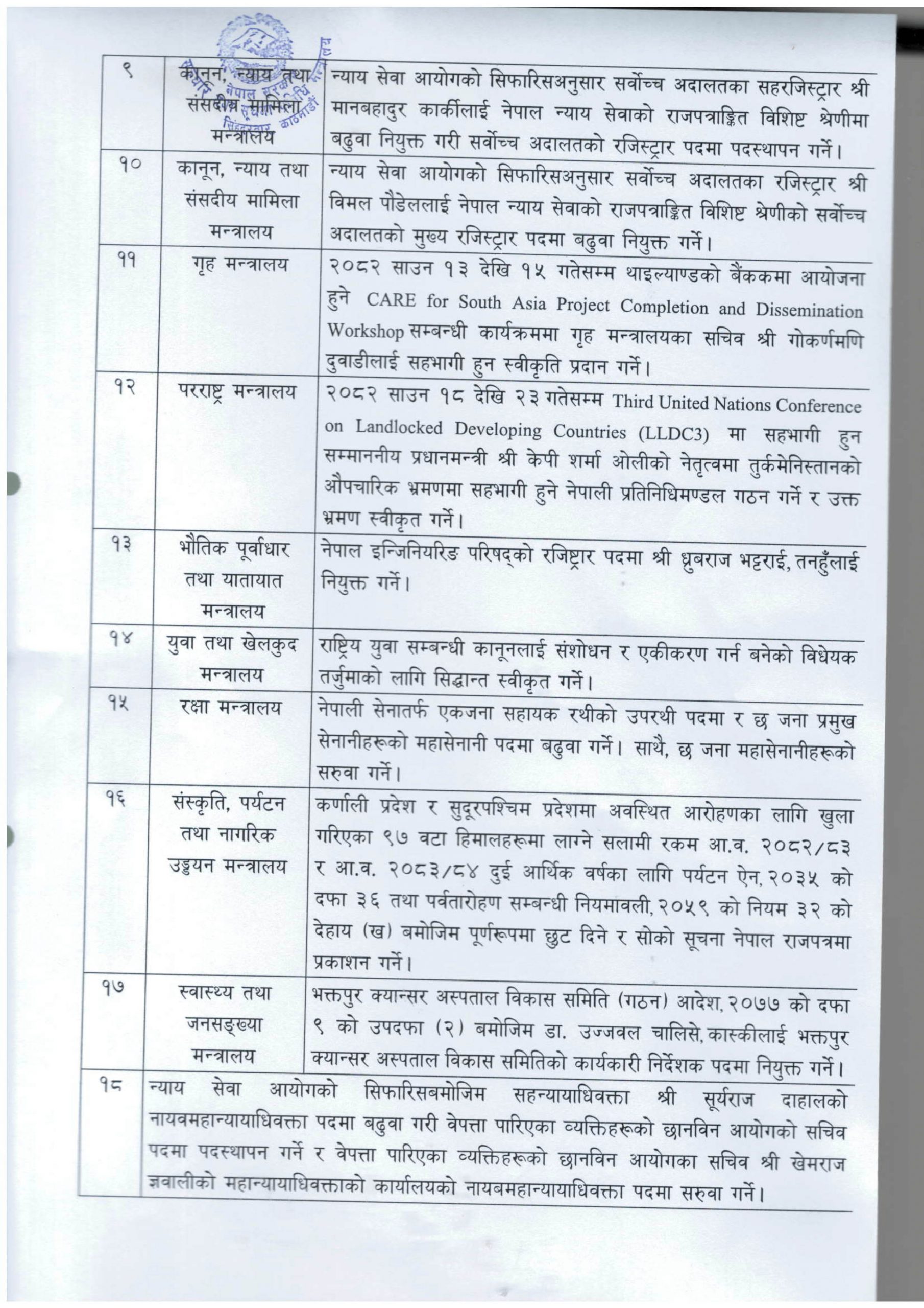 बैठकले न्याय सेवा आयोगको सिफारिस अनुसार सर्वोच्च अदालतका रजिष्टार विमल पौडेललाई मुख्य रजिष्टार पदमा बढुवा गरेको छ । बैठकले नेपाल इन्जिनियरिङ परिषद्को रजिष्टारमा तनहुँका ध्रुवराज भट्टराईलाई नियुक्त गरेको छ भने भक्तपुर क्यानसर अस्पताल विकास समितिको कार्यकारी निर्देशकमा कास्कीका डा।उज्जवल चालिसेलाई नियुक्त गर्ने निर्णय गरेको छ ।त्यस्तै, रानी जमरा सिँचाइ आयोजना तेस्रो चरणका लागि विश्व बैंक समूहको अन्तर्राष्ट्रिय विकास संस्थाबाट प्राप्त हुने करिब १८ अर्ब ९२ करोड नेपाली रूपैया बराबरको सहुलीयतपूर्ण ऋण सहायता पनि स्वीकार गरिएको छ ।