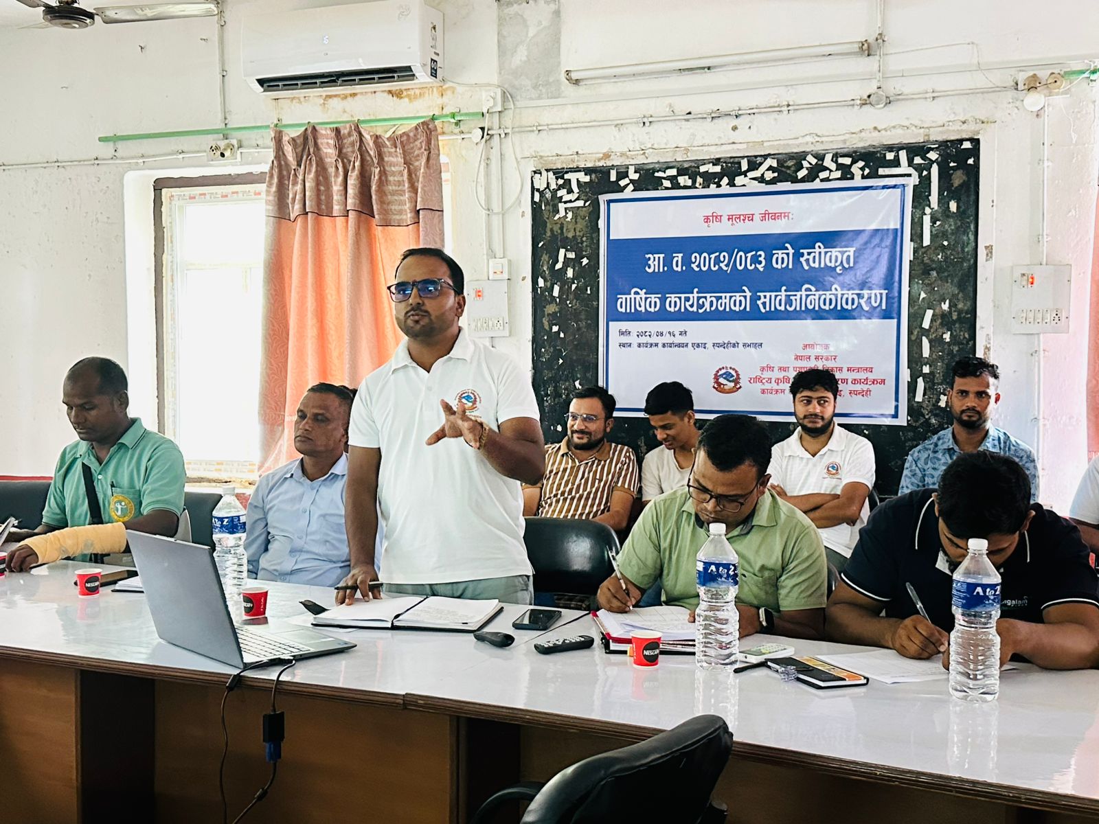 कार्यक्रमका अध्यक्ष एवं कार्यान्वयन एकाइ रूपन्देहीका प्रमुख नारायण काफ्लेले विगत वर्षहरूको कार्य सम्पादन विवरण प्रस्तुत गर्दै, आगामी योजनाहरूको जानकारी दिएनु भयो ।