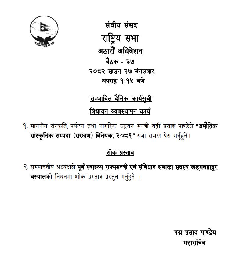 काठमाडौं। राष्ट्रियसभाको बैठक बस्दैँछ ।संघीय संसद भवन, नयाँ बानेश्वरमा बस्नेछ । दिउँसो १ः१५ बजे बस्नेछ ।आजको बैठकमा संस्कृति, पर्यटन तथा नागरिक उड्डयन मन्त्री बद्रीप्रसाद पाण्डेले ‘अभौतिक सांस्कृतिक सम्पदा (संरक्षण) बिधेयक, २०८१ सभा समक्ष पेश गर्नेछन् भने पुर्व स्वास्थ्य राज्य मन्त्री एवम संबिधानसभा सदस्य खडगबहादुर बस्यालको निधनमा शोक प्रस्ताव प्रस्तुत गर्नेछन् ।